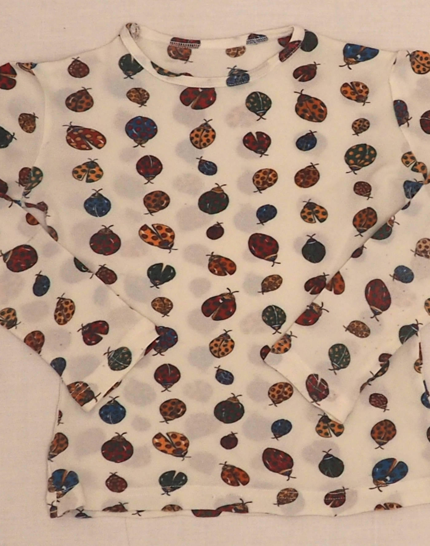 Joli T-shirt à manches longues en mesh blanc avec imprimé coccinelles multicolores. Très bon état, tissu acétate.