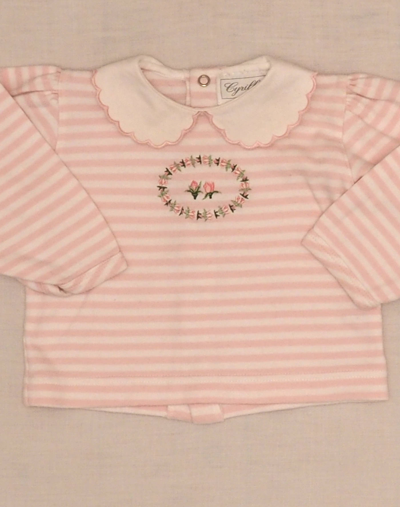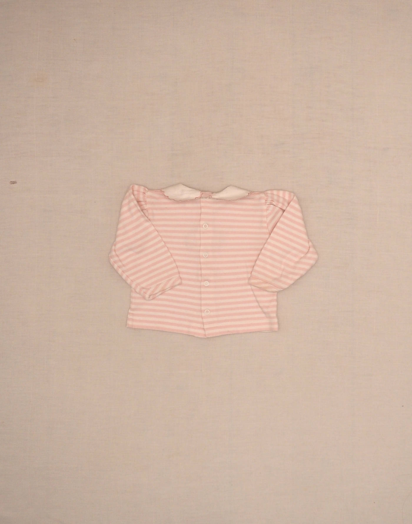Charmant haut en jersey tout doux à rayures blanches et roses, manches longues avec bouffant aux épaules, motif de roses brodé sur le buste col blanc brodé. Fermé dans le dos par cinq boutons pression. Très bon état, 100% coton.