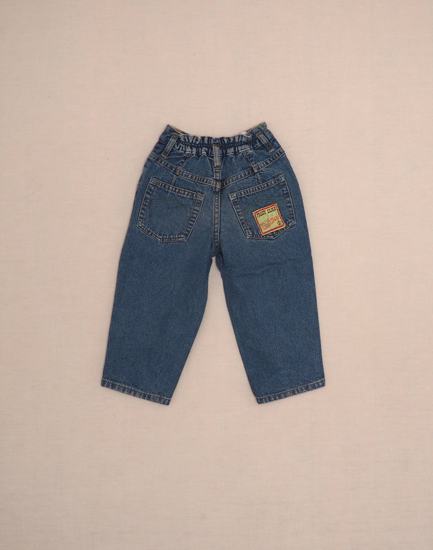Parfait basique, jean bleu avec pinces à la taille, deux poches devant, deux poches plaquées derrière avec un patch, taille élastique avec bouton et braguette. Très bon état, 100% coton.