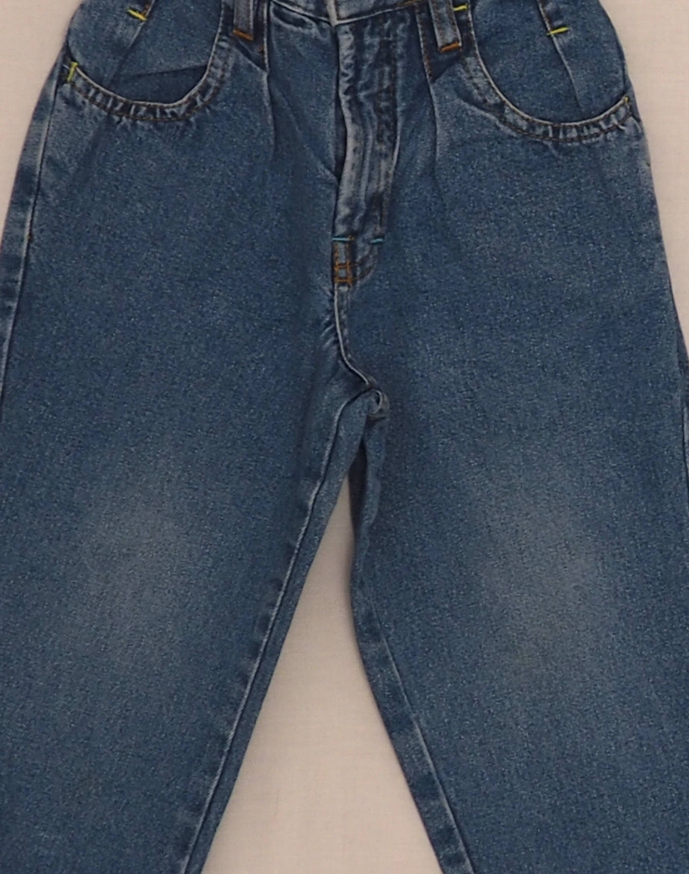 Parfait basique, jean bleu avec pinces à la taille, deux poches devant, deux poches plaquées derrière avec un patch, taille élastique avec bouton et braguette. Très bon état, 100% coton.