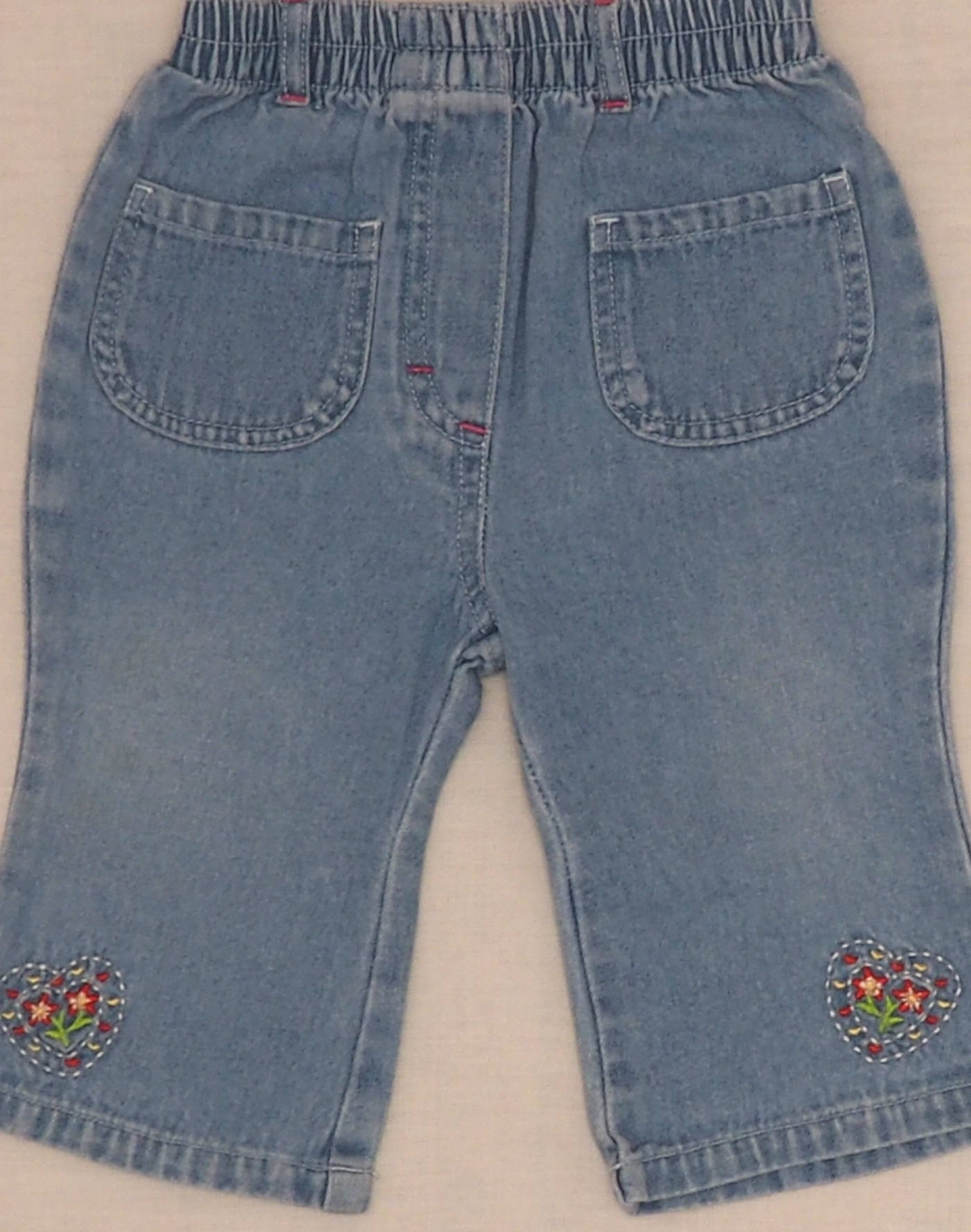 Joli jean légèrement évasé brodé sur le bas de jambe de deux coeurs, deux poches plaquées devant, taille élastique. Très bon état, 100% coton.