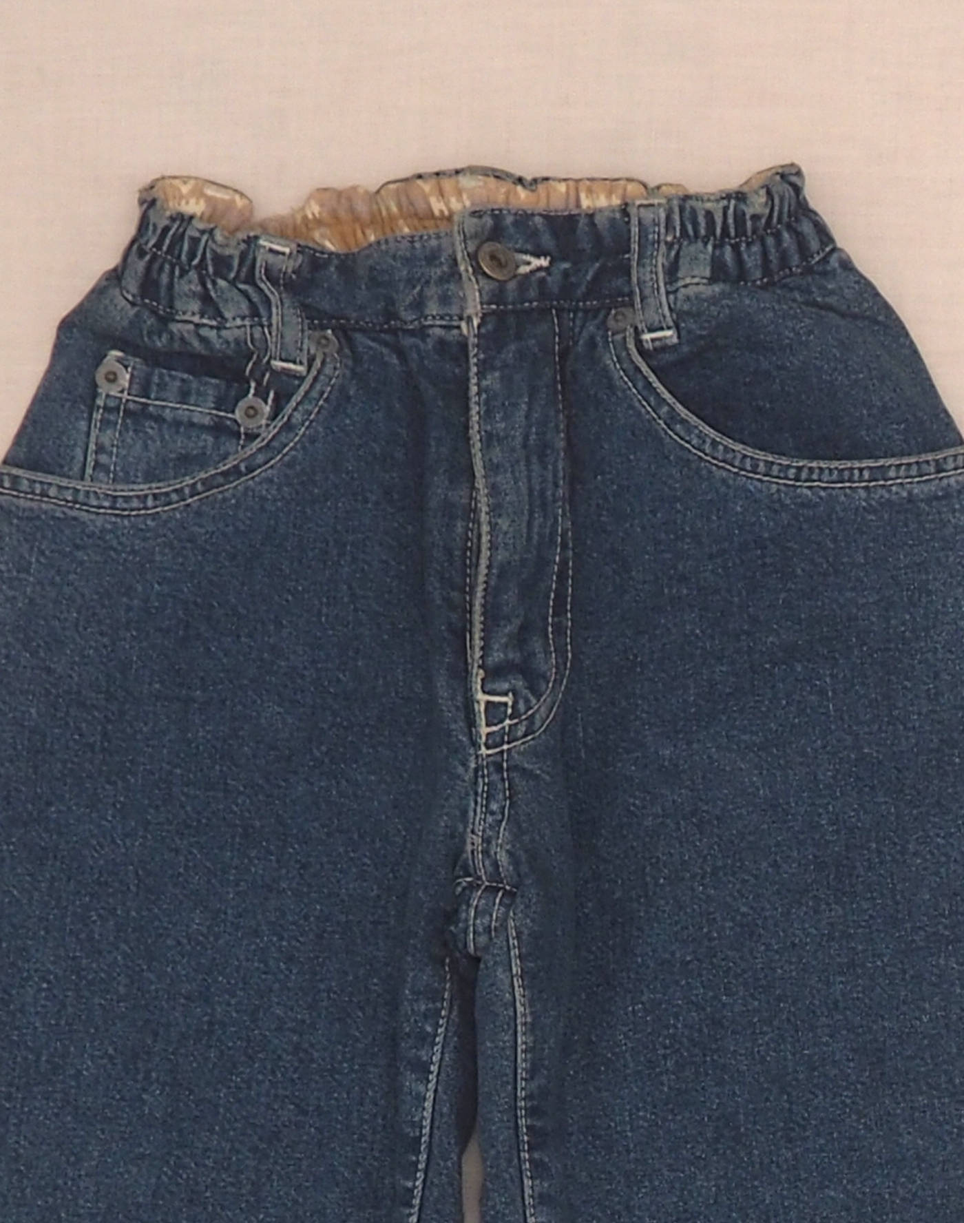 Etat neuf avec étiquette. Beau jean « Liberto » entièrement doublé en coton à motif géométriques, deux pcohes devant, deux poches plaquées derrière, taille élastique avec un bouton et braguette. Etat neuf, 100% coton.