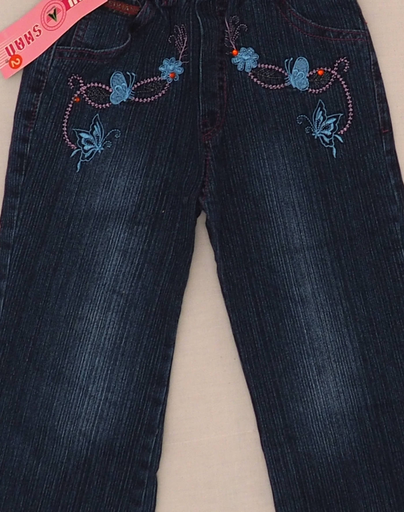 Parfaitement années 1990, jean taille élastique évasé sur le bas de jambe et brodé de petites fleurs et papillons sur la taille, couture contrastante rose, effet délavé sur les jambes, deux poches devant, deux poches plaquées derrière. Etat neuf avec étiquette, 100% coton.