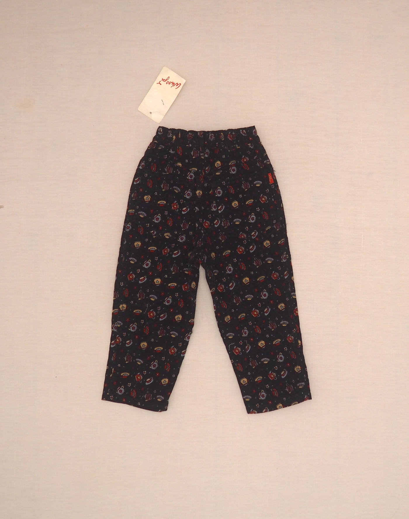 Adorable jean en velours finement côtelé bleu marine, motif tasses & théières. Deux poches devant, deux poches plaquées derrière, taille élastique avec bouton et braguette. Etat neuf avec étiquette, 100% coton.