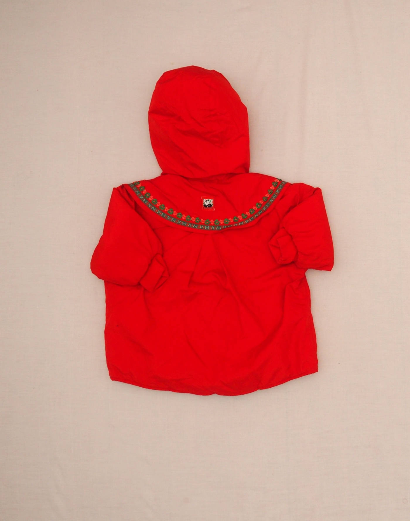 Catimini vintage. Ravissant manteau rouge à capuche entièrement molletonné, effet cape sur les épaules bordée de deux rubans brodés, fermeture éclair avec rabat boutonné au col. Doublure verte. Très bon état, doublure 100% coton, tissu extérieur polyester. Fabriqué en Pologne.