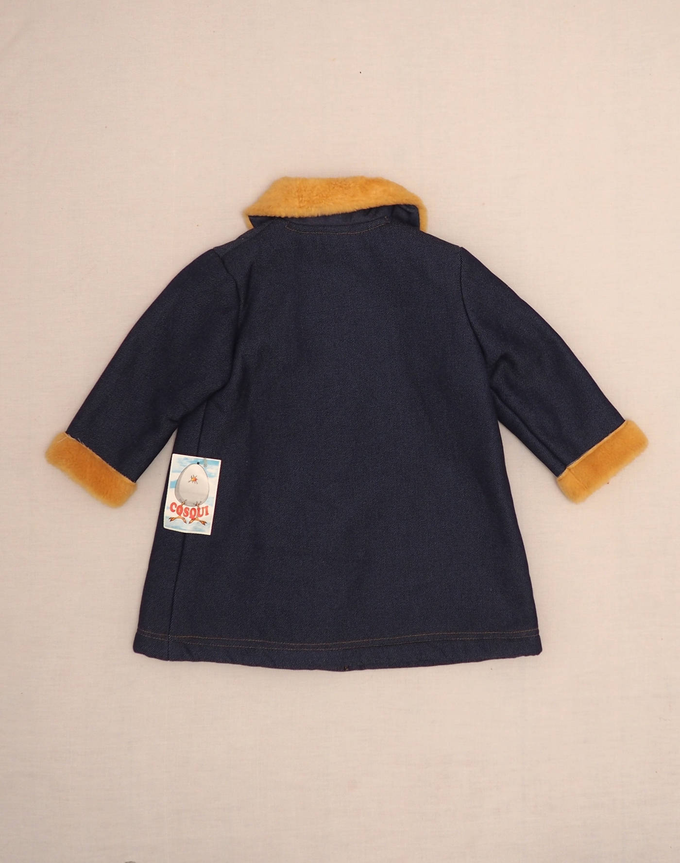 Elégant manteau bleu marine effet jean entièrement doublé en fausse fourrure apparente sur le col et les poignets. Fermé par quatre boutons, deux fausses poches sur le côté. Fabriqué en Espagne, très bon état, 100% coton.