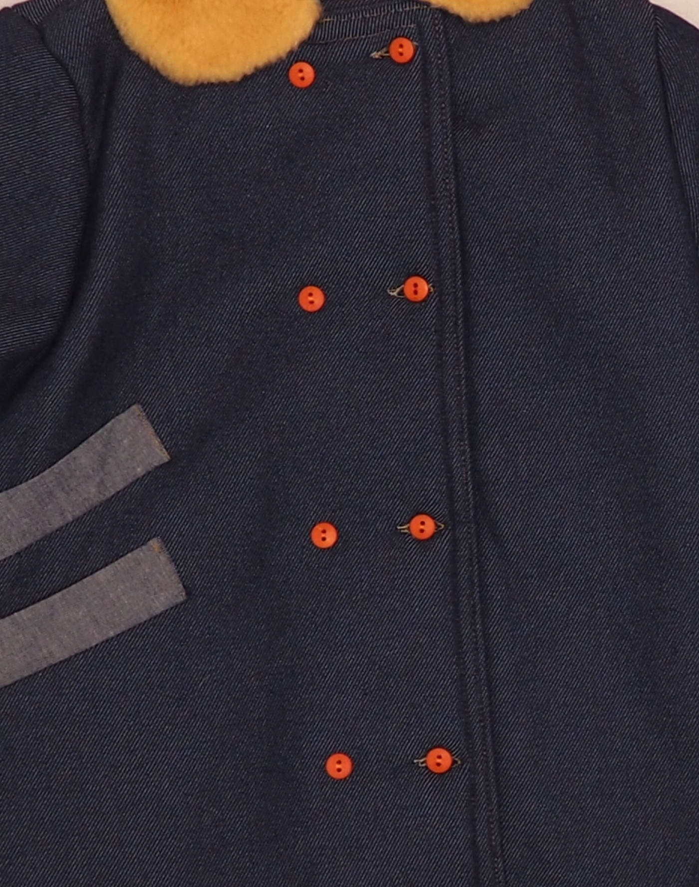 Elégant manteau bleu marine effet jean entièrement doublé en fausse fourrure apparente sur le col et les poignets. Fermé par quatre boutons, deux fausses poches sur le côté. Fabriqué en Espagne, très bon état, 100% coton.
