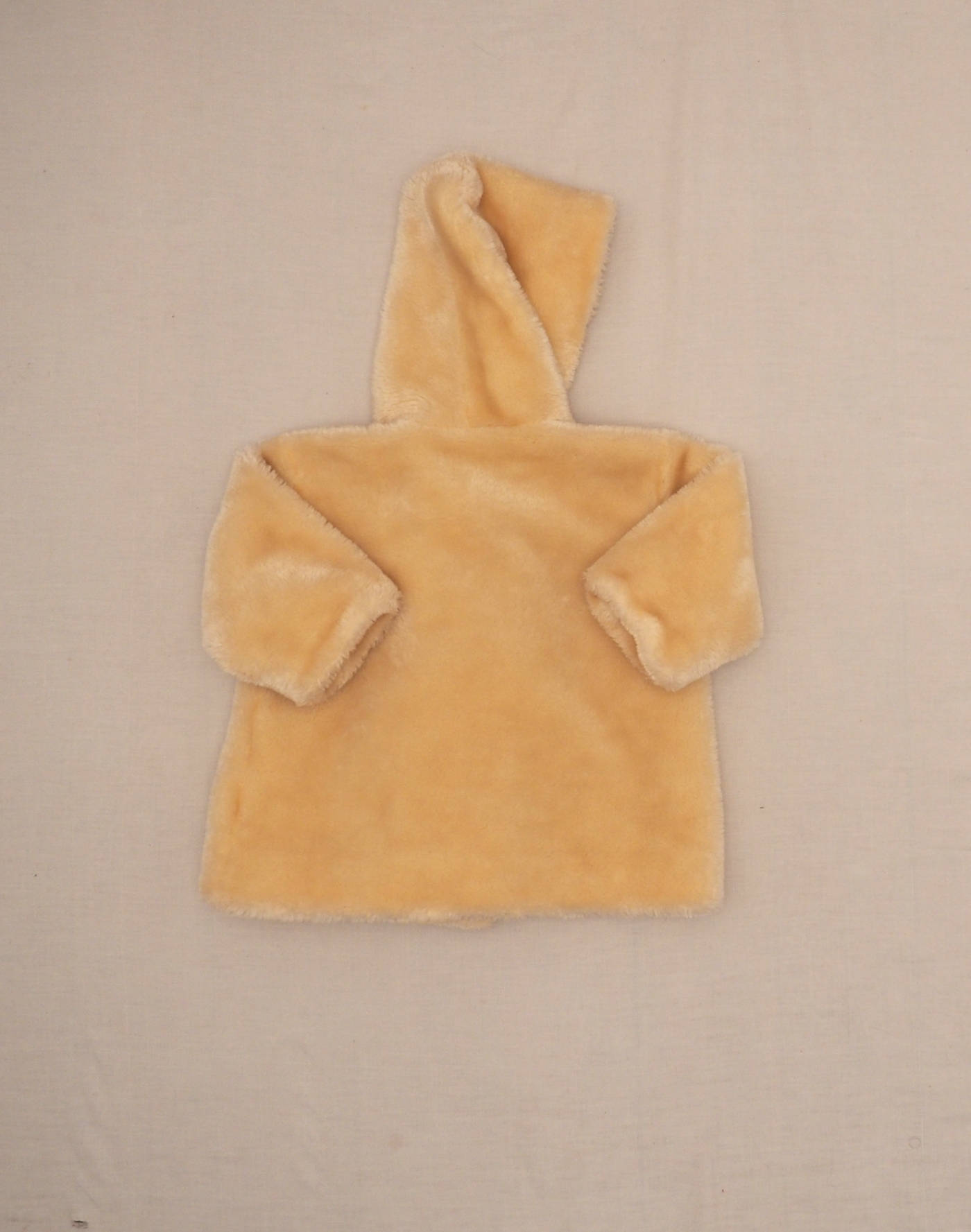 Années 1970. Très beau manteau en fausse fourrure écru à capuche, fermée par quatre boutons devant, doublure satin. Fabriqué en France, très bon état, pas d’étiquette de composition.
