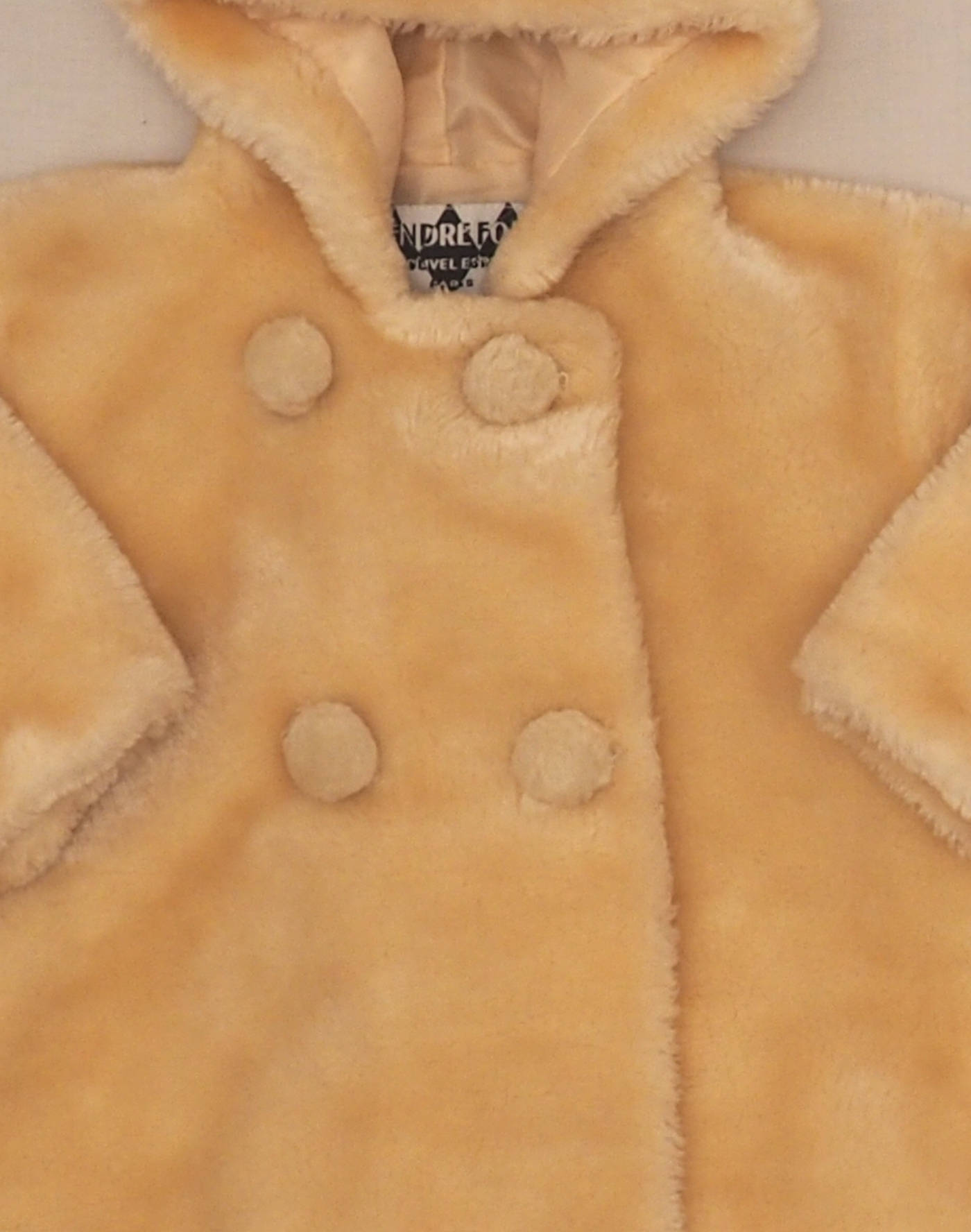 Années 1970. Très beau manteau en fausse fourrure écru à capuche, fermée par quatre boutons devant, doublure satin. Fabriqué en France, très bon état, pas d’étiquette de composition.