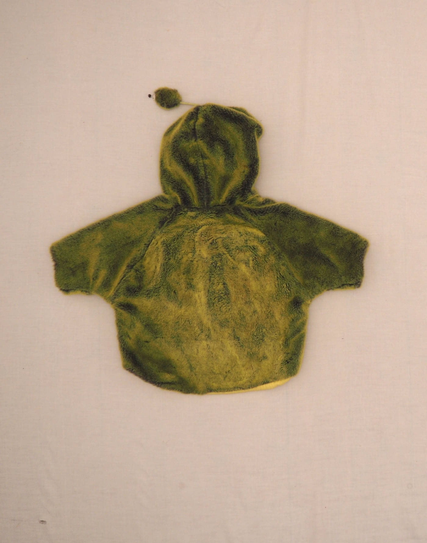 Catimini Vintage. Magnifique manteau en fausse fourrure verte doublé en jersey jaune, capuche avec cordon et petit hérisson au bout, manches chauve-souris. Fermé par trois boutons pression. Très bon état, pas d’étiquette de composition mais toucher coton pour la doublure.