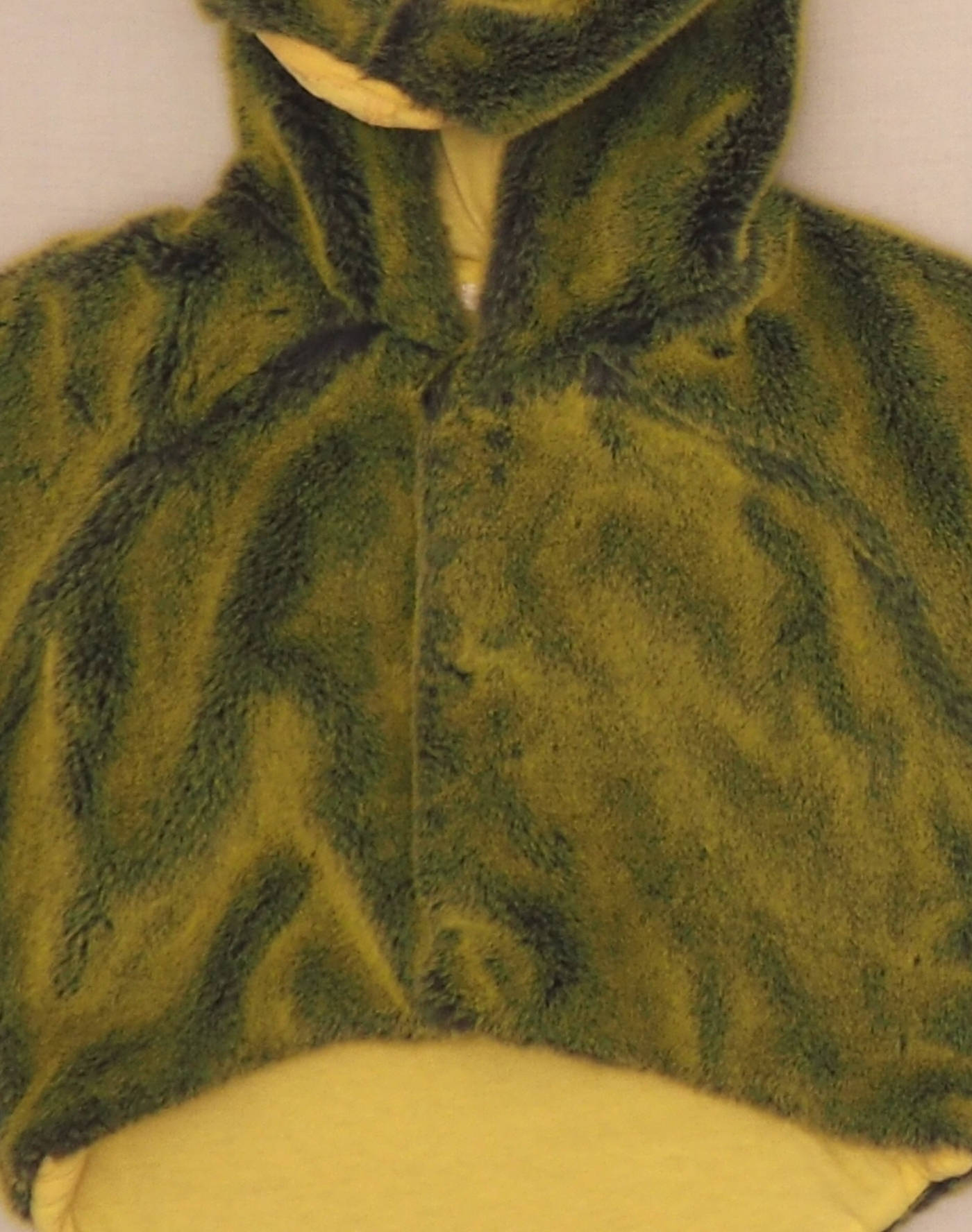 Catimini Vintage. Magnifique manteau en fausse fourrure verte doublé en jersey jaune, capuche avec cordon et petit hérisson au bout, manches chauve-souris. Fermé par trois boutons pression. Très bon état, pas d’étiquette de composition mais toucher coton pour la doublure.