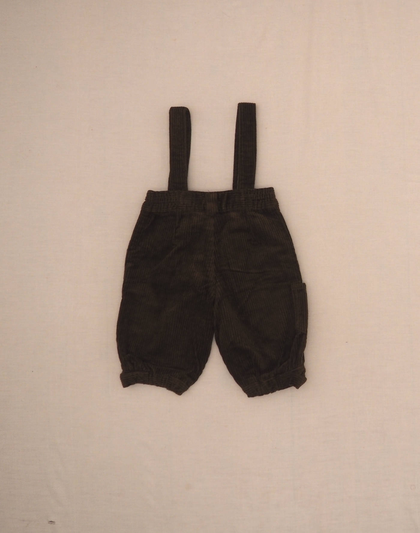 Petit Bateau vintage. Beau pantalon à bretelles en velours côtelé épais marron, deux poches devant, une poche sur le côté d’un jambe, boutonné aux chevilles, fermé à la taille par un bouton et braguette, bretelles détachables boutonnées devant et derrière. Très bon état, tissu 92% coton, 8% polyester.