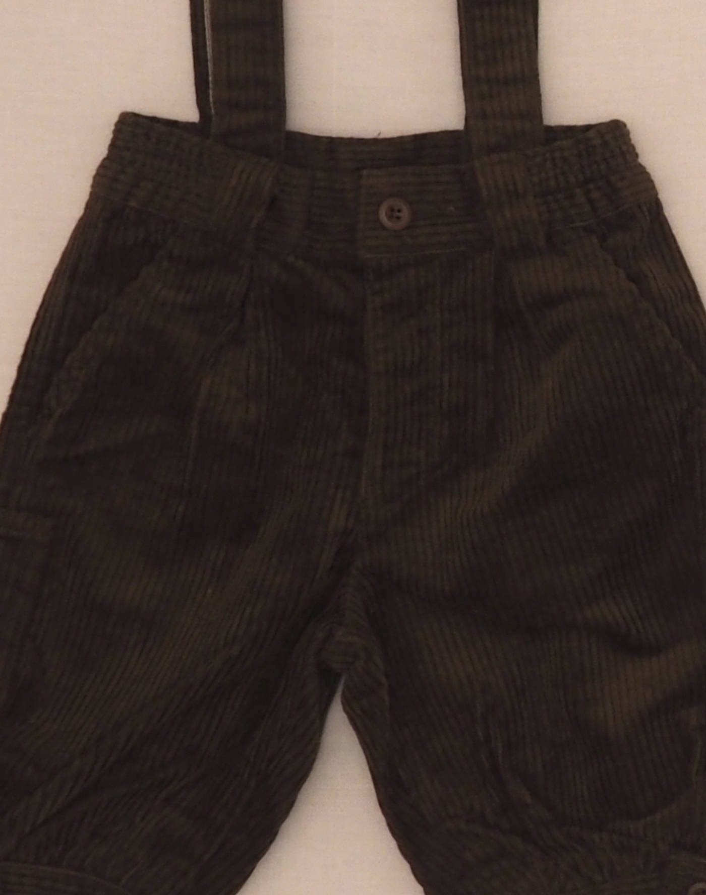 Petit Bateau vintage. Beau pantalon à bretelles en velours côtelé épais marron, deux poches devant, une poche sur le côté d’un jambe, boutonné aux chevilles, fermé à la taille par un bouton et braguette, bretelles détachables boutonnées devant et derrière. Très bon état, tissu 92% coton, 8% polyester.