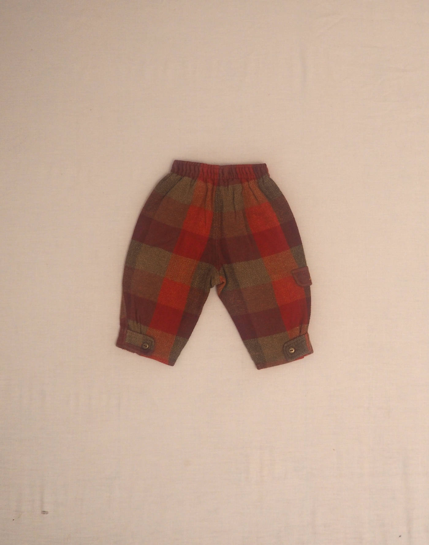 Mignon pantalon bien chaud pour l’hiver, effet lainage à carreaux sur l’extérieur, entièrement doublé en jersey orange. Une fausse poche sur le côté brodée ‘Bouh” avec deux yeux cachés en dessous. Taille élastique. Boutonnage sur le bas de jambe. Très bon état, tissu extérieur 55% coton, 45% acrylique, tissu intérieur 100% coton.