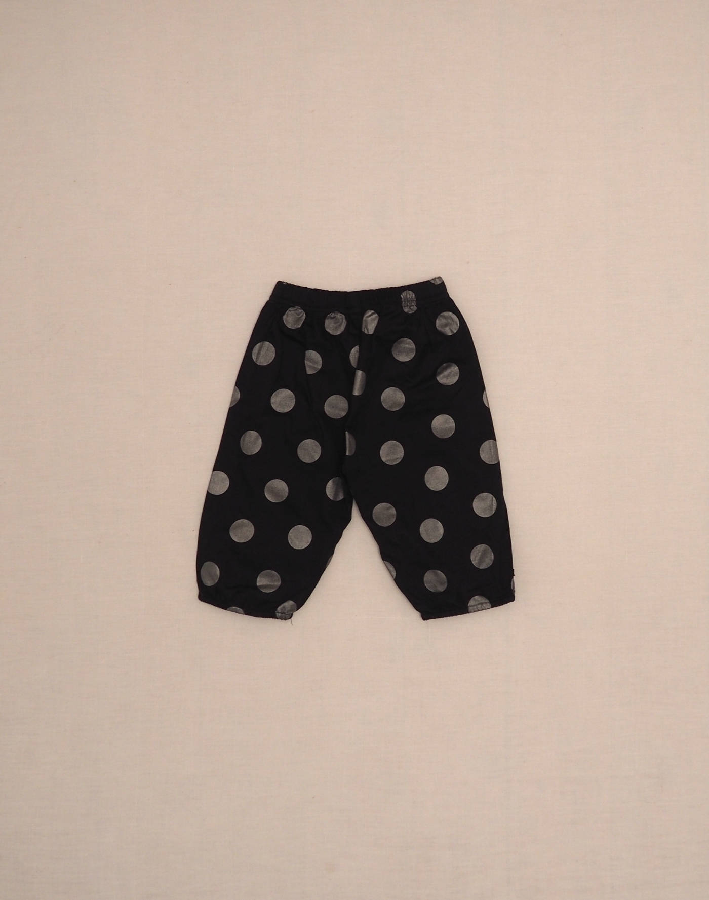 Mignon pantalon en coton léger noir avec gros pois gris argentés. Elastique à la taille et aux chevilles. Très bon état, 100% coton.