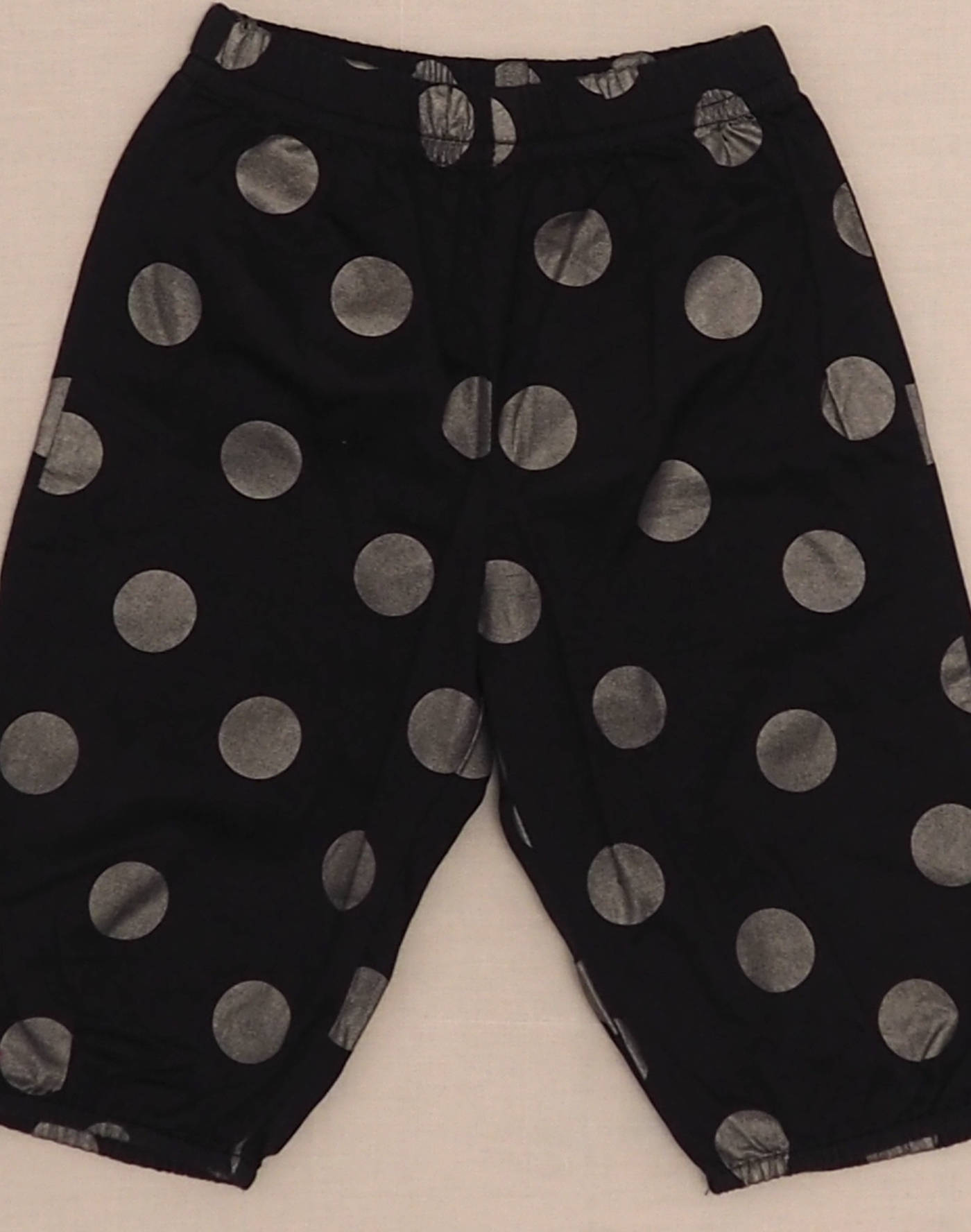 Mignon pantalon en coton léger noir avec gros pois gris argentés. Elastique à la taille et aux chevilles. Très bon état, 100% coton.