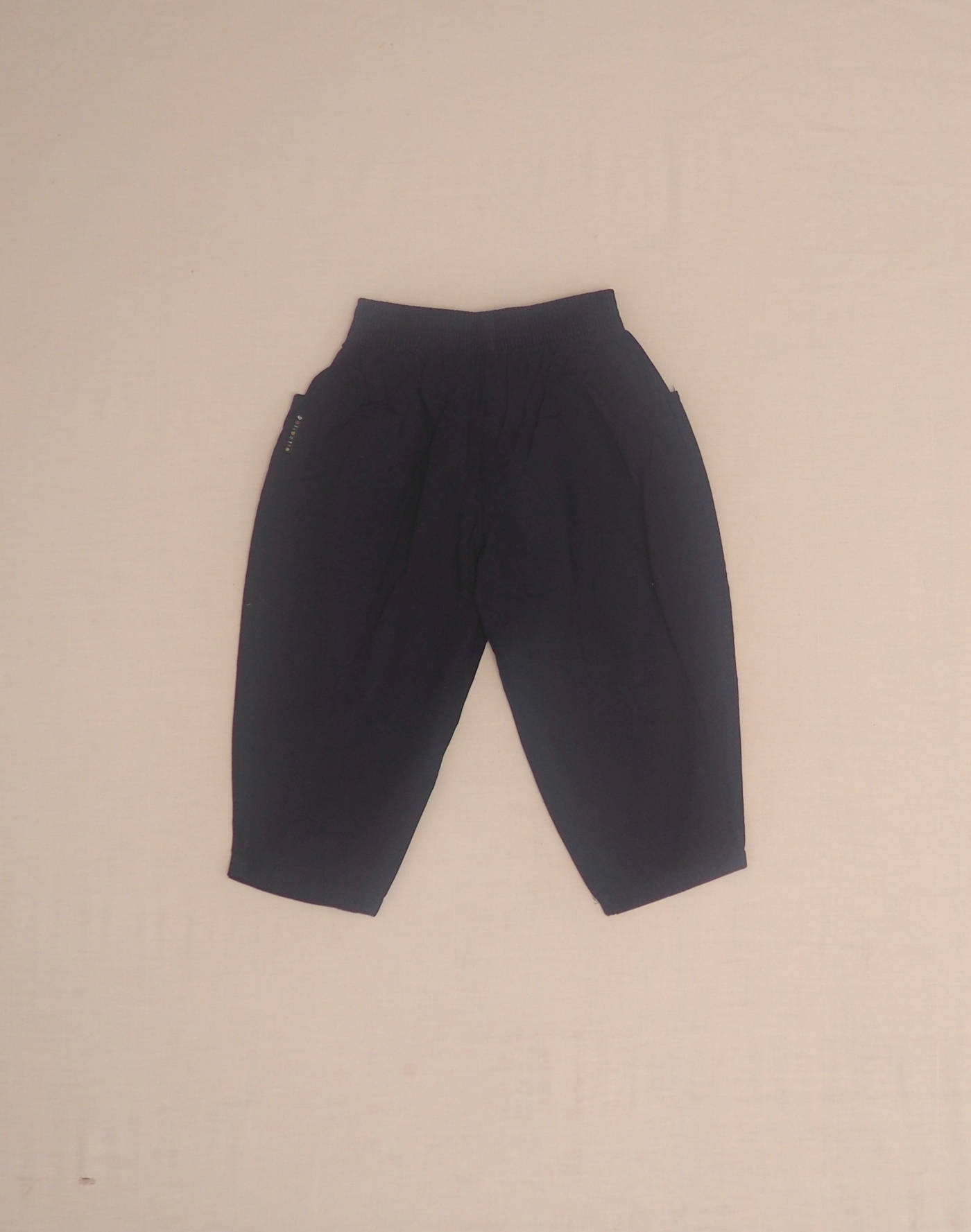 Très chic pantalon en coton léger bleu marine, coupe légèrement bouffante, taille élastique, deux poches devant avec une petite broderie fleur & bateau sur le côté. Très bon état, 100% coton.