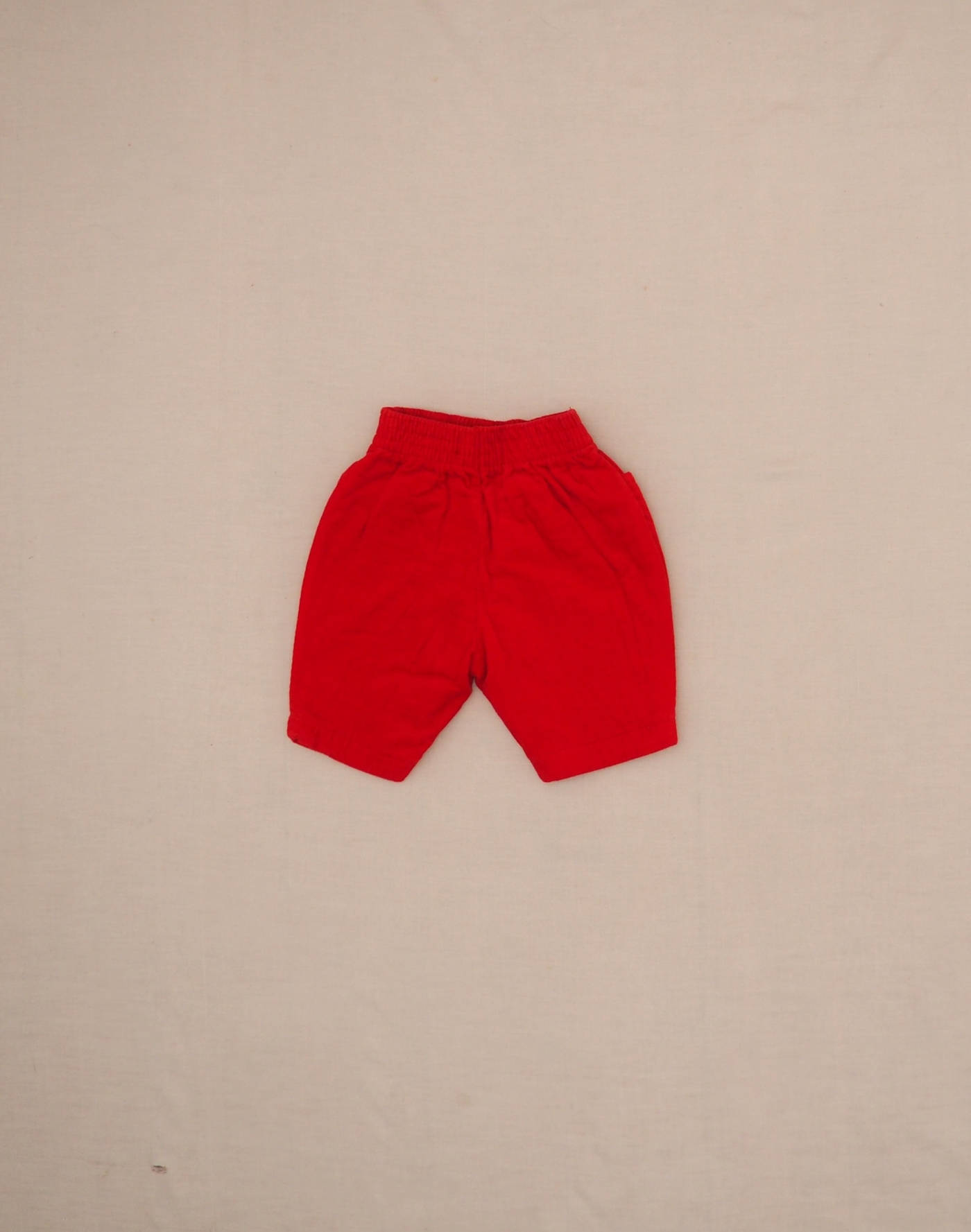 Pantalon d’hiver doublé en velours côtelé rouge, taille élastique, deux poches devant, brodé “De bouche à oreille” sur une jambe. Très bon état, 100% coton.
