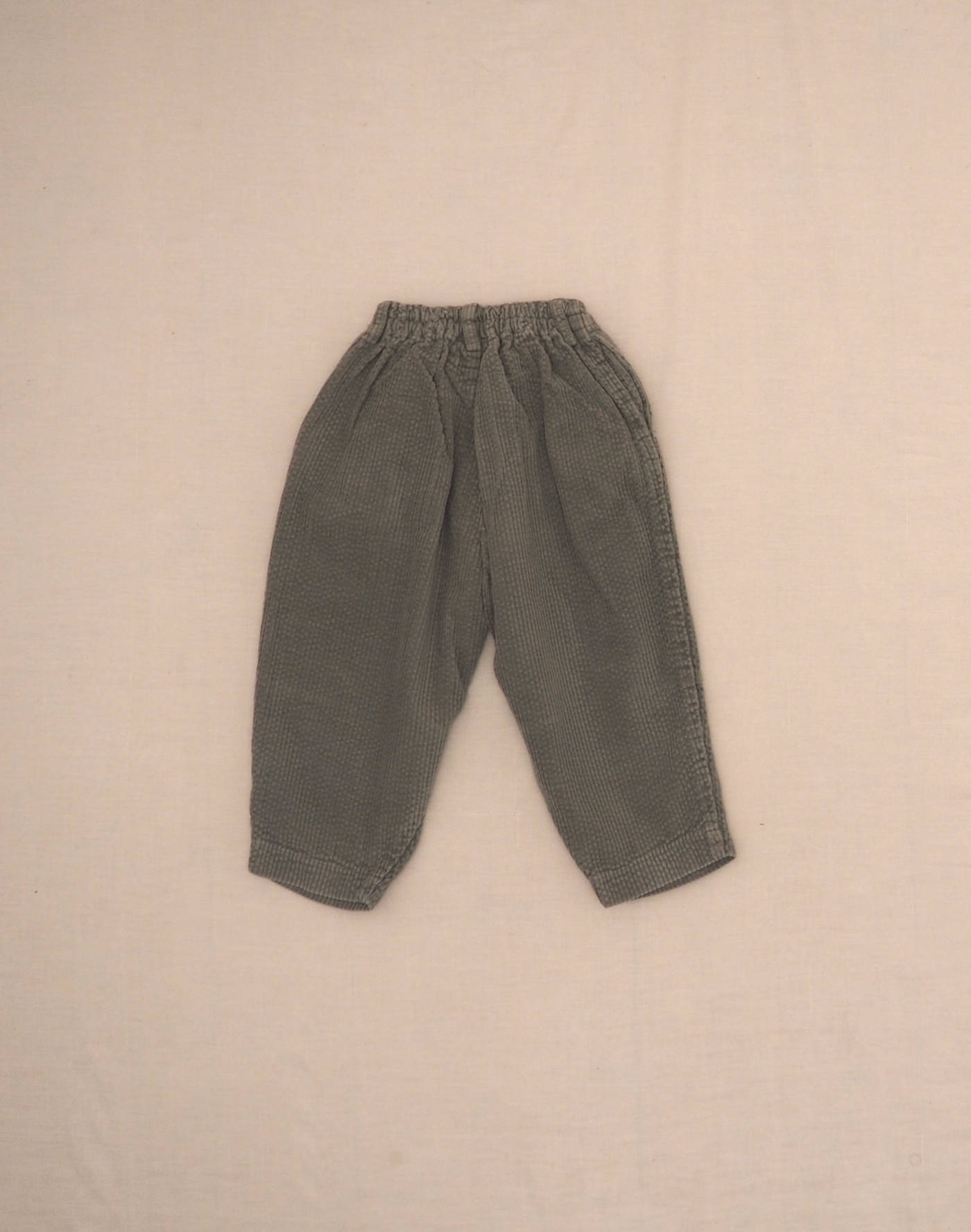 Parfait basique, pantalon en velours côtelé épais gris, taille élastique, deux poches sur les côtés. Fabriqué en France, 100% coton. Légère usure du velours mais bon état général, d’où le petit prix.