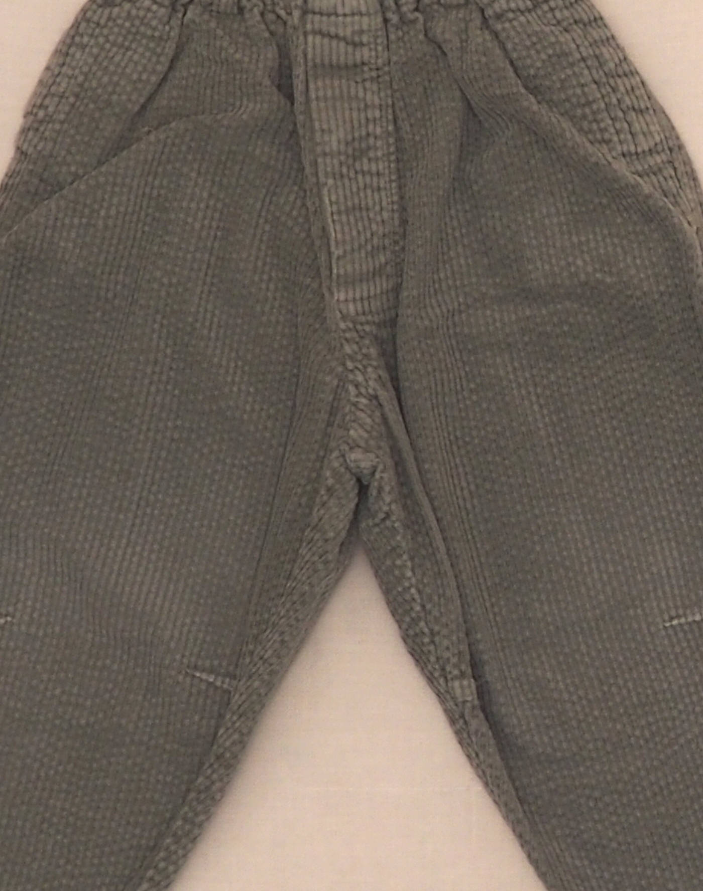 Parfait basique, pantalon en velours côtelé épais gris, taille élastique, deux poches sur les côtés. Fabriqué en France, 100% coton. Légère usure du velours mais bon état général, d’où le petit prix.