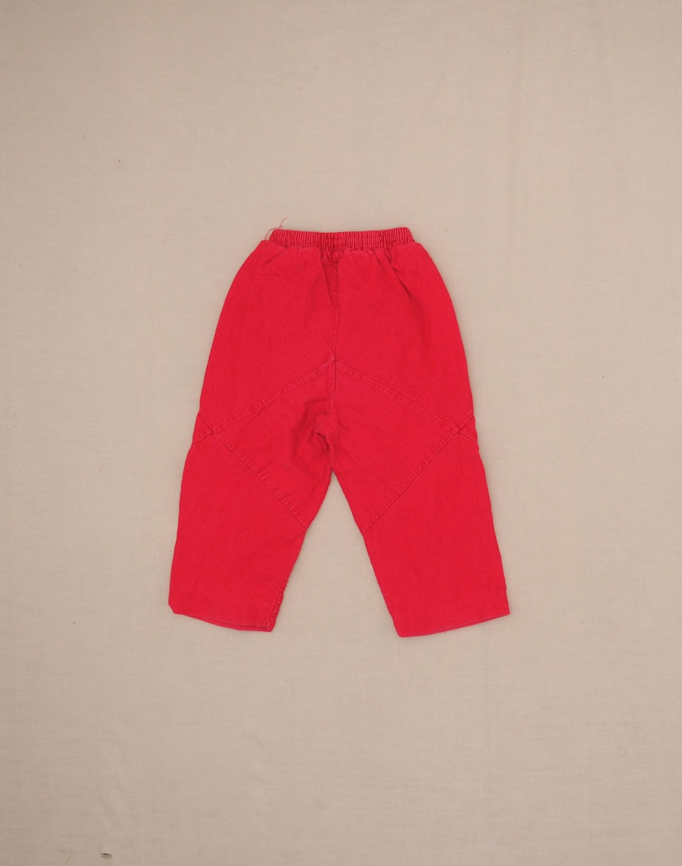 Beau pantalon entièrement doublé en velours finement côtelé rose, taille élastique, broderie sur une jambe. Légère usure du velours par endroit mais bon état, d’où le petit prix. Fabriqué en France, 100% coton.