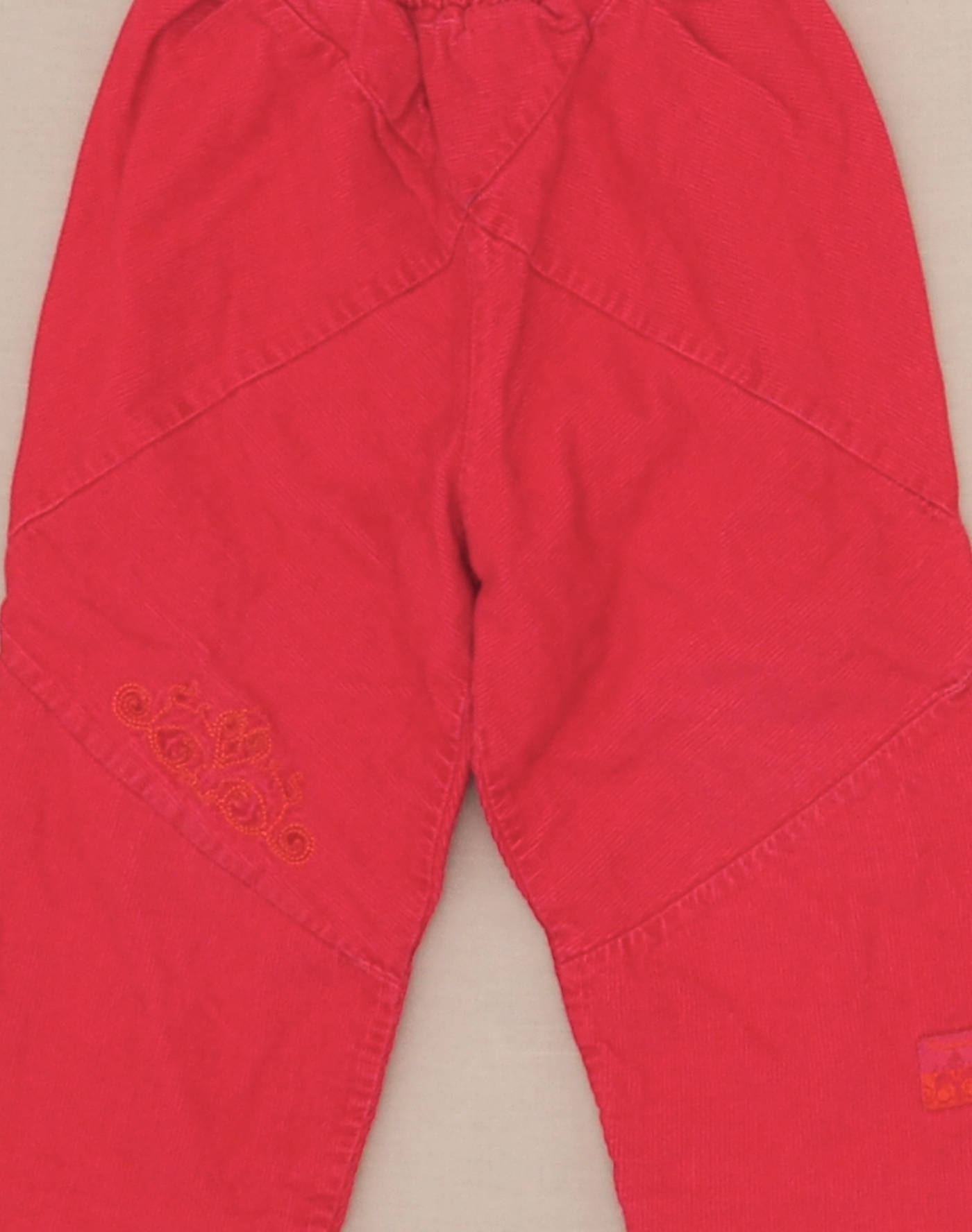 Beau pantalon entièrement doublé en velours finement côtelé rose, taille élastique, broderie sur une jambe. Légère usure du velours par endroit mais bon état, d’où le petit prix. Fabriqué en France, 100% coton.
