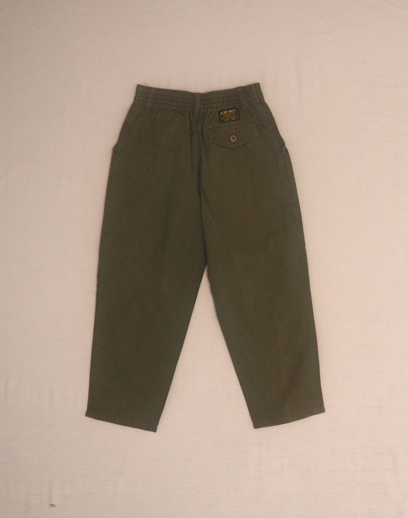 Taille 6 ans. Elégant pantalon à pinces, deux poches devant, une fausse poche à rabat derrière, taille élastique avec passants pour une ceinture. Fabriqué en France, bon état mais patiné par le soleil, 100% coton.
