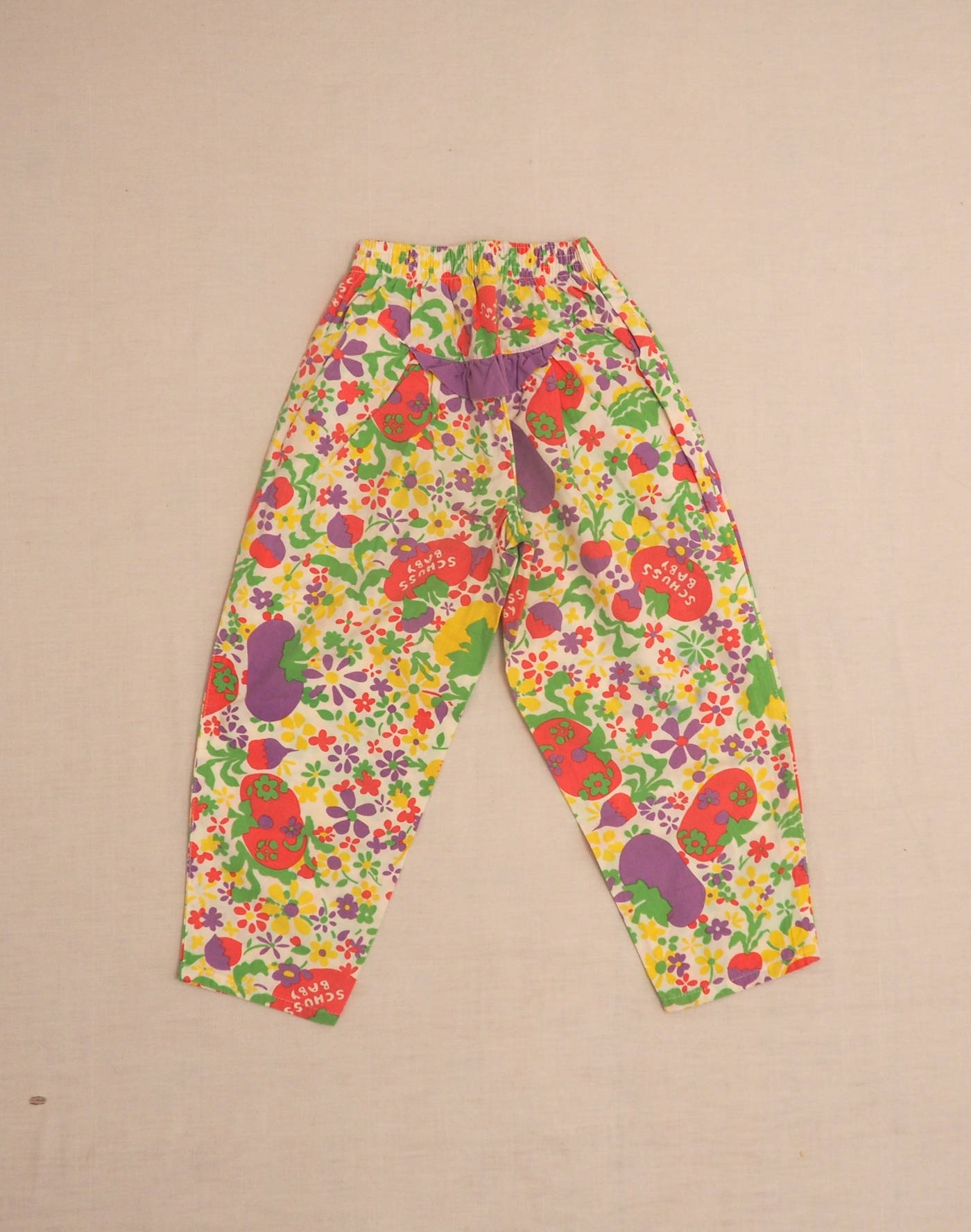 Adorable pantalon en coton léger à motifs fruits, petit volant derrière, taille élastique. Fabriqué en Espagne, très bon état, 100% coton.