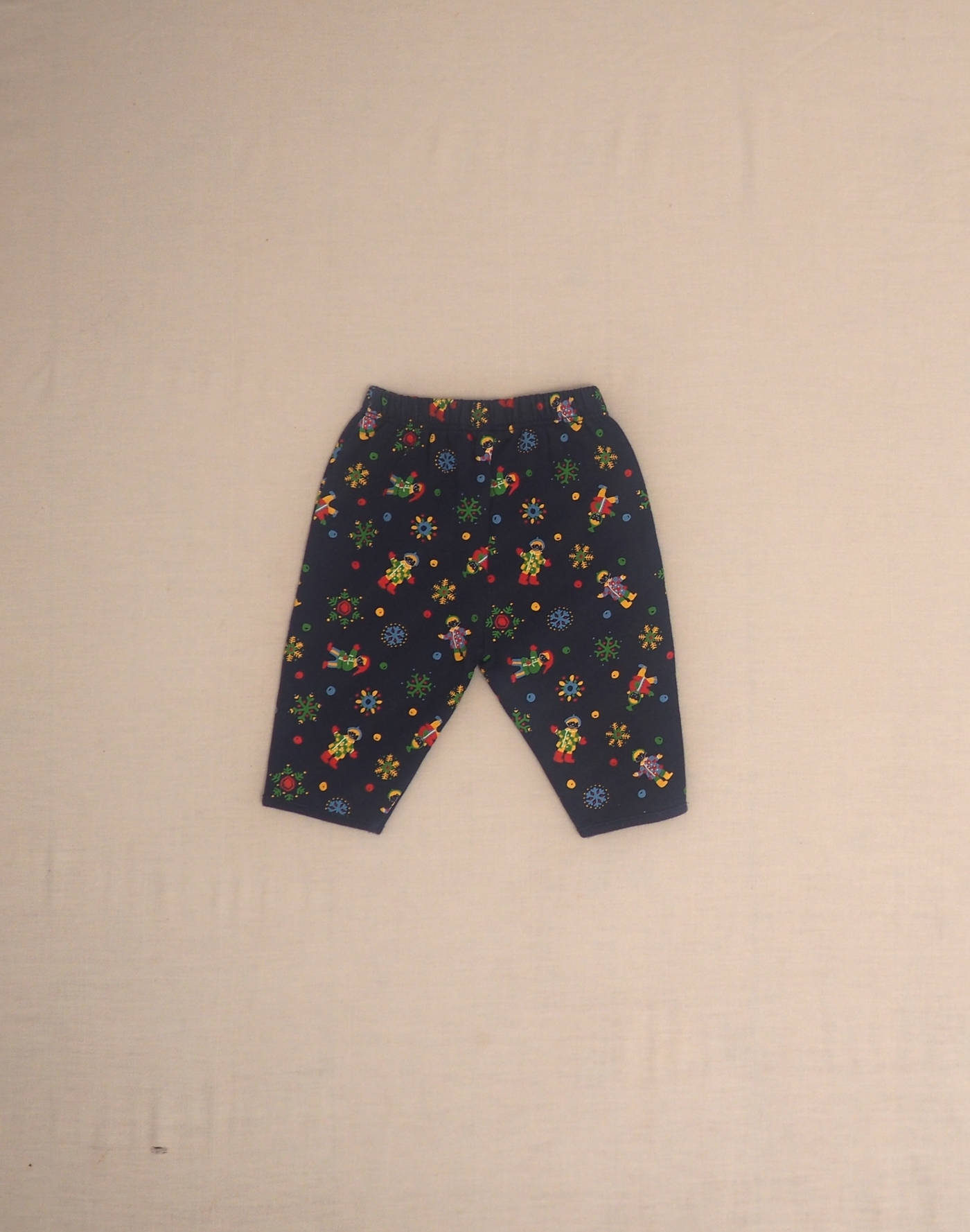 Mignon pantalon en jersey très doux bleu marine avec motif petits bonshommes et boules de neige. Taille élastique. Très bon état, jersey 80% coton, 20% polyester.