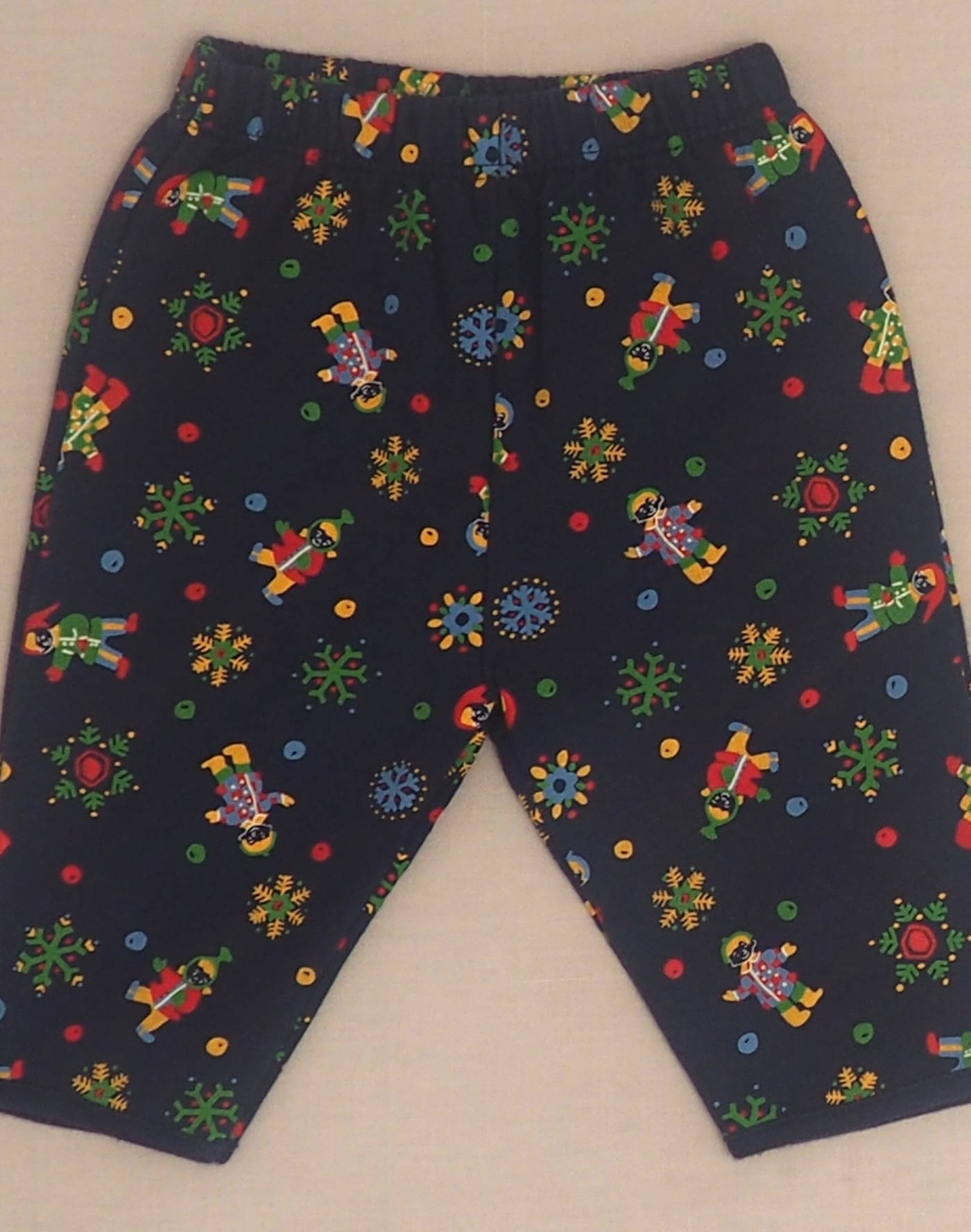Mignon pantalon en jersey très doux bleu marine avec motif petits bonshommes et boules de neige. Taille élastique. Très bon état, jersey 80% coton, 20% polyester.