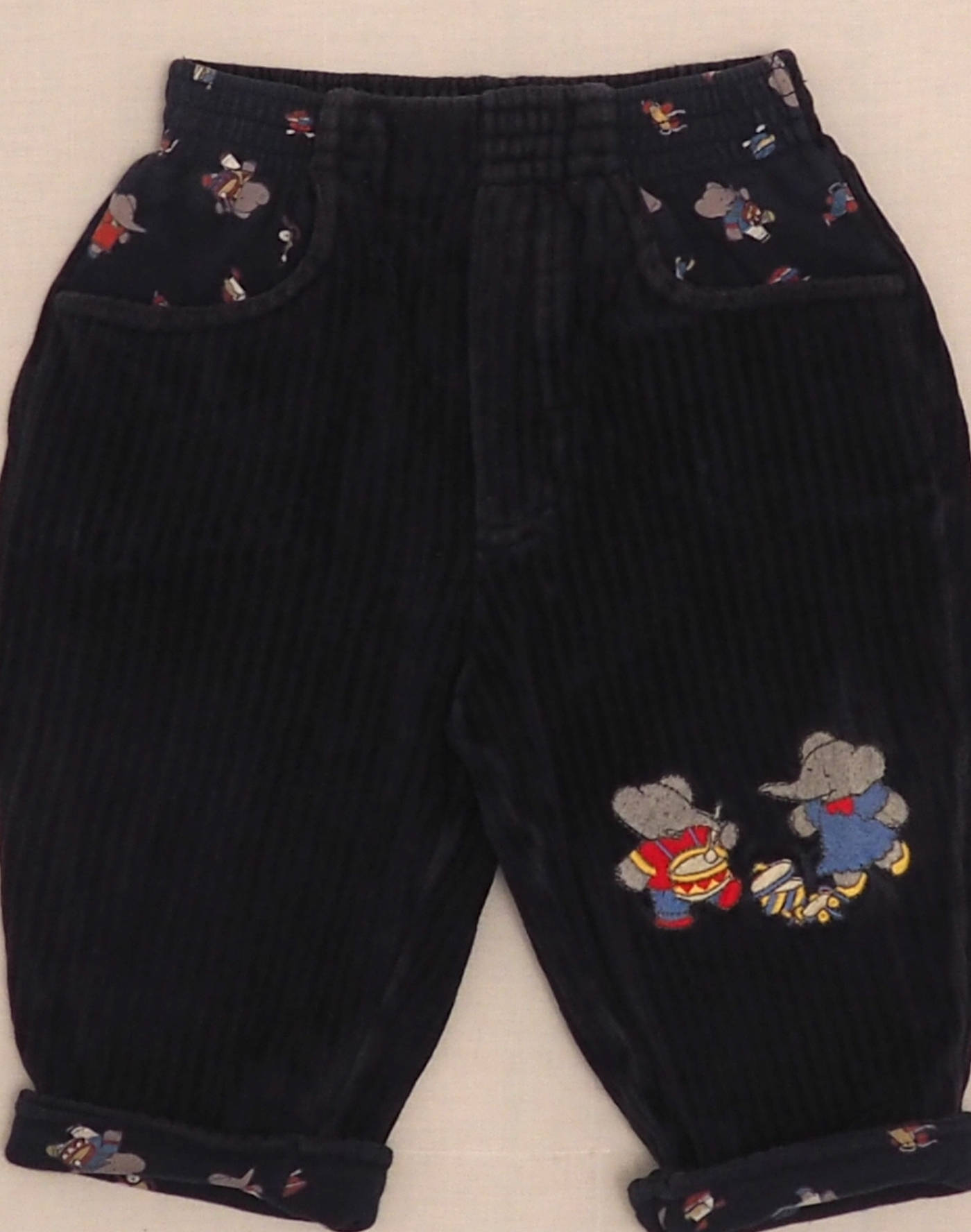 Beau pantalon en velours côtelé épais marine, brodé Babar sur une jambe, poches et revers de pantalon doublé en jersey motif Babar, taille élastique. Bon état en dehors d’un légère usure du velours sur la taille, d’où le petit prix.