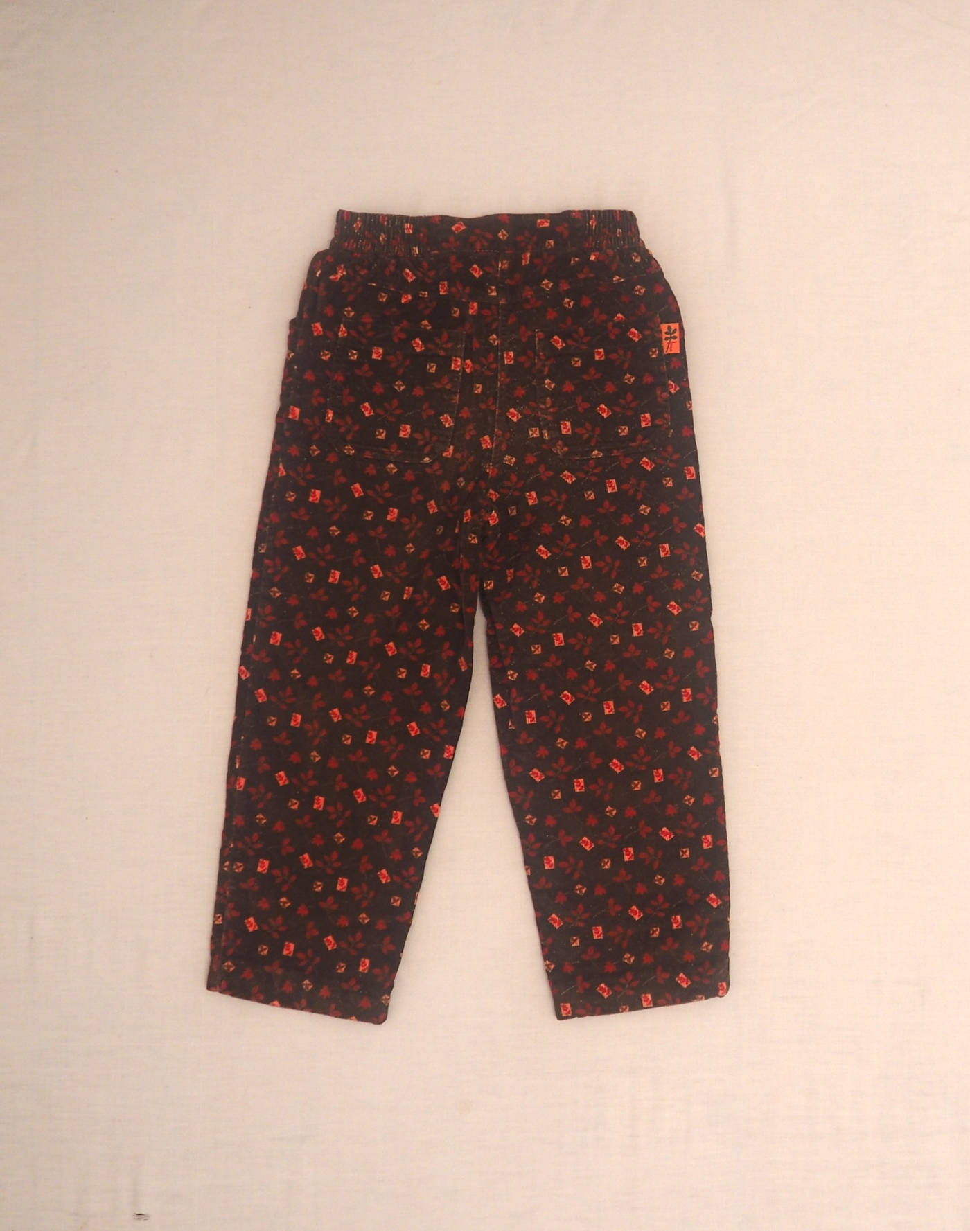 Taille 6 ans. Beau pantalon en velours finement côtelé bordeaux à motif petites feuilles. Taille élastique fermée par un bouton et braguette, deux poches devant, deux poches plaquées derrière. Très bon état, 100% coton.