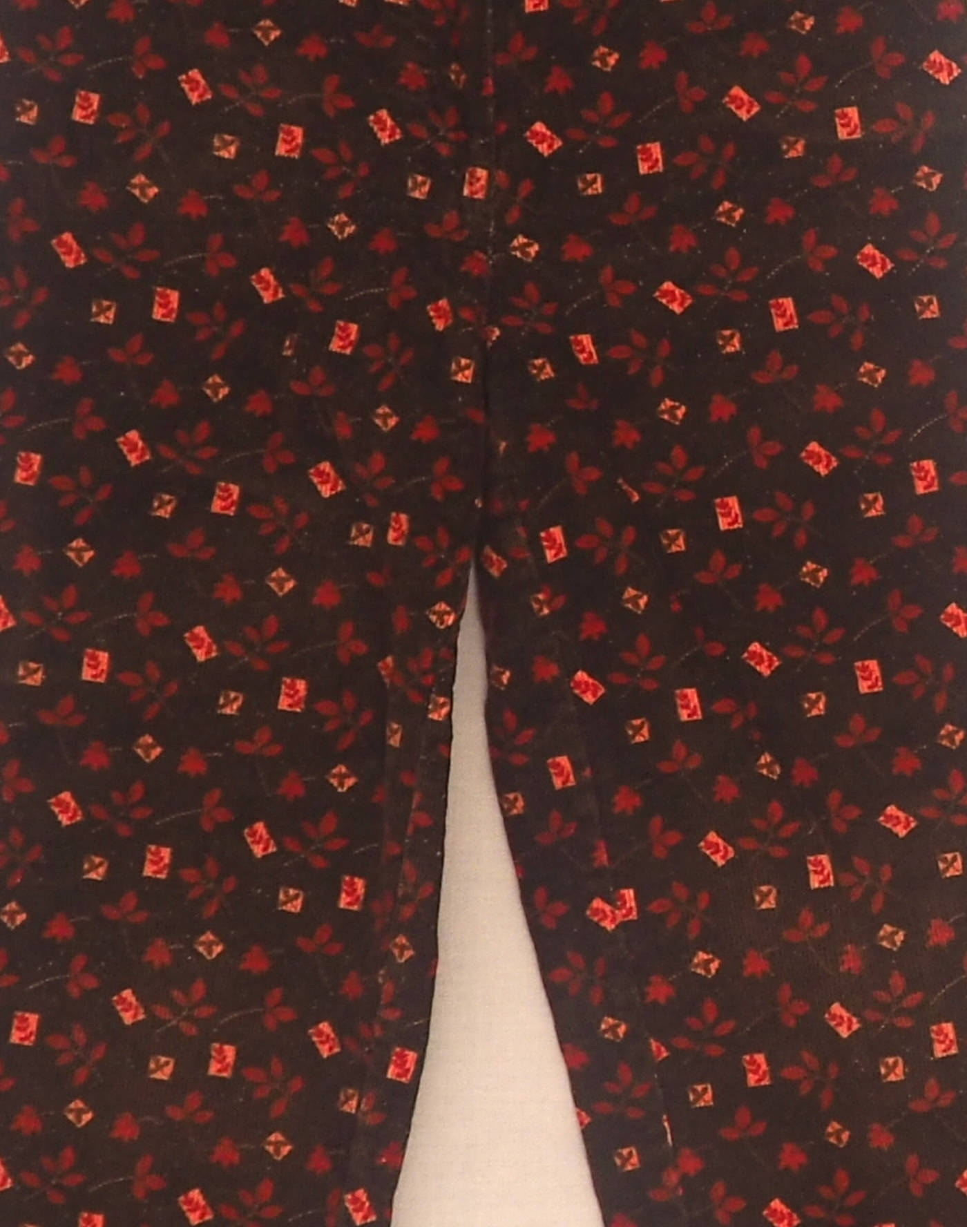 Taille 6 ans. Beau pantalon en velours finement côtelé bordeaux à motif petites feuilles. Taille élastique fermée par un bouton et braguette, deux poches devant, deux poches plaquées derrière. Très bon état, 100% coton.