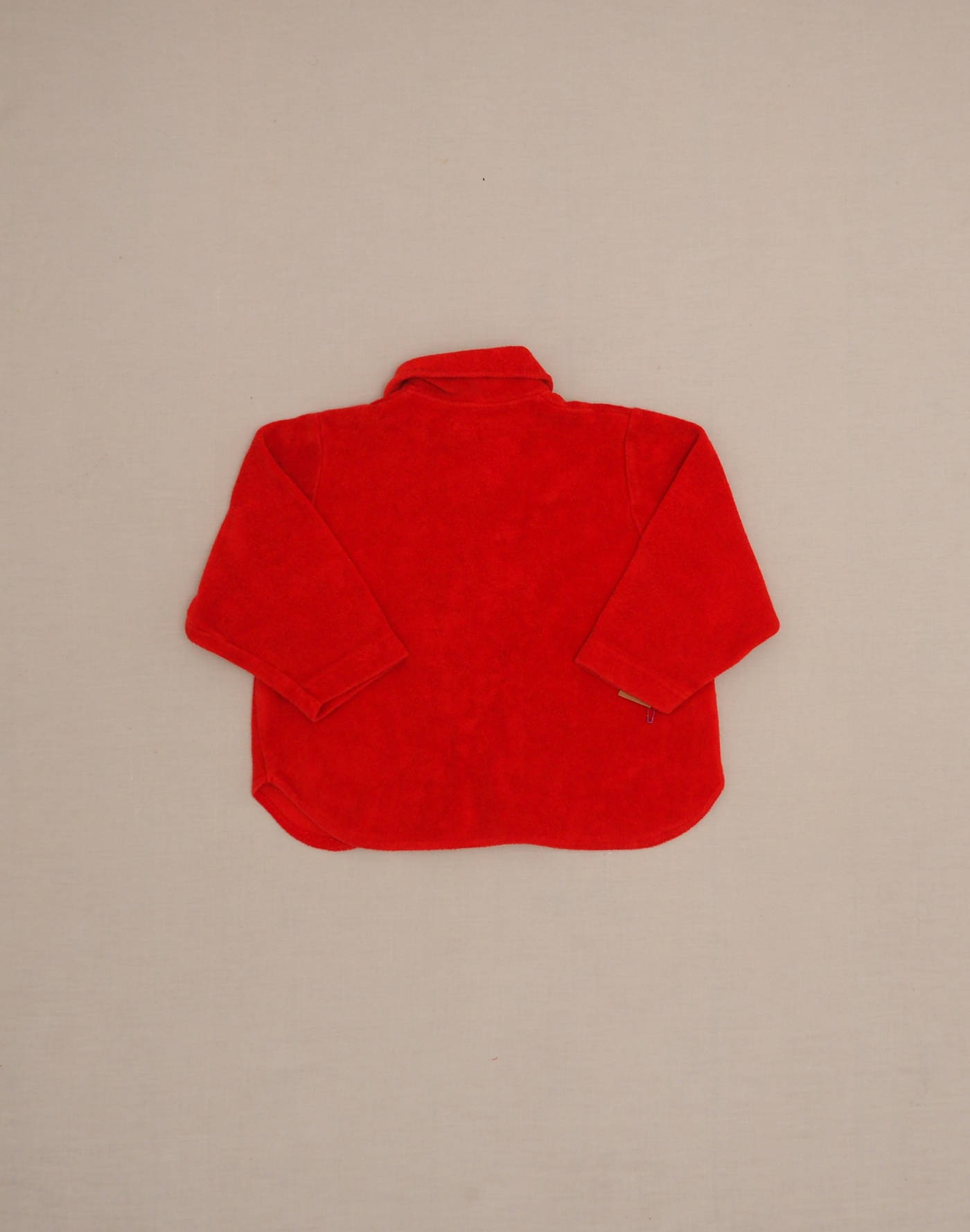 Très beau polo en jersey éponge rouge, deux poches et col brodés de fleurs, un patch coquelicot d’un côté, fermé par quatre boutons gravés. Fabriqué en France, très bon état, jersey 80% coton, 20% polyester.