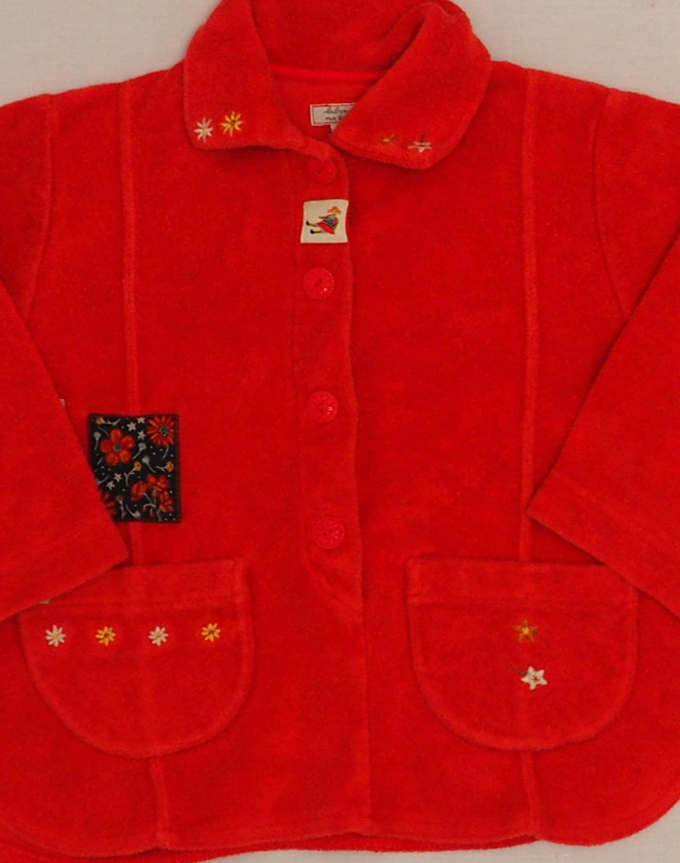 Très beau polo en jersey éponge rouge, deux poches et col brodés de fleurs, un patch coquelicot d’un côté, fermé par quatre boutons gravés. Fabriqué en France, très bon état, jersey 80% coton, 20% polyester.