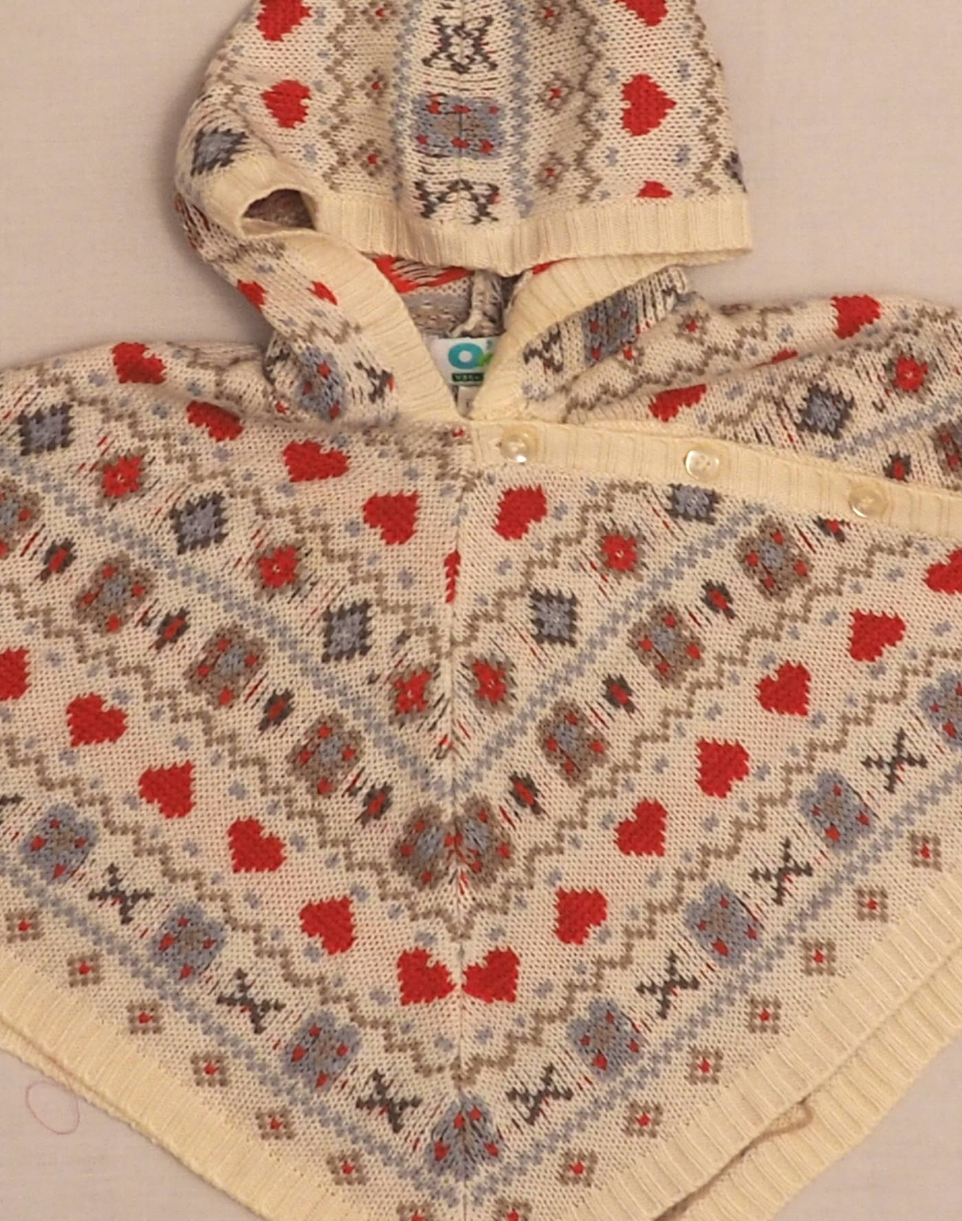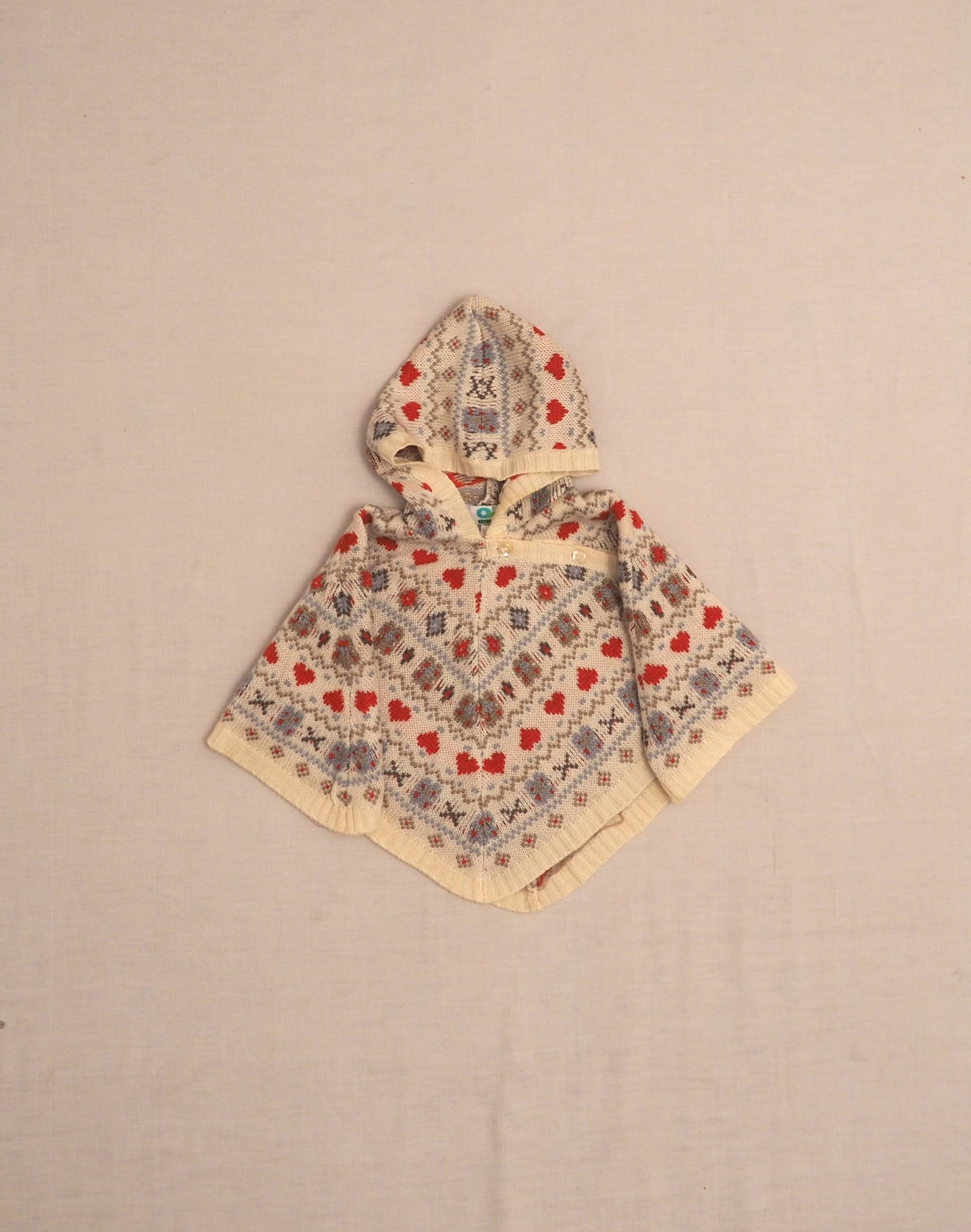 Ravissant poncho à capuche en maille jacquard à motifs multicolores sur fond écru. Fermeture en biais par six boutons nacrés. Très bon état, pas d’étiquette de composition.