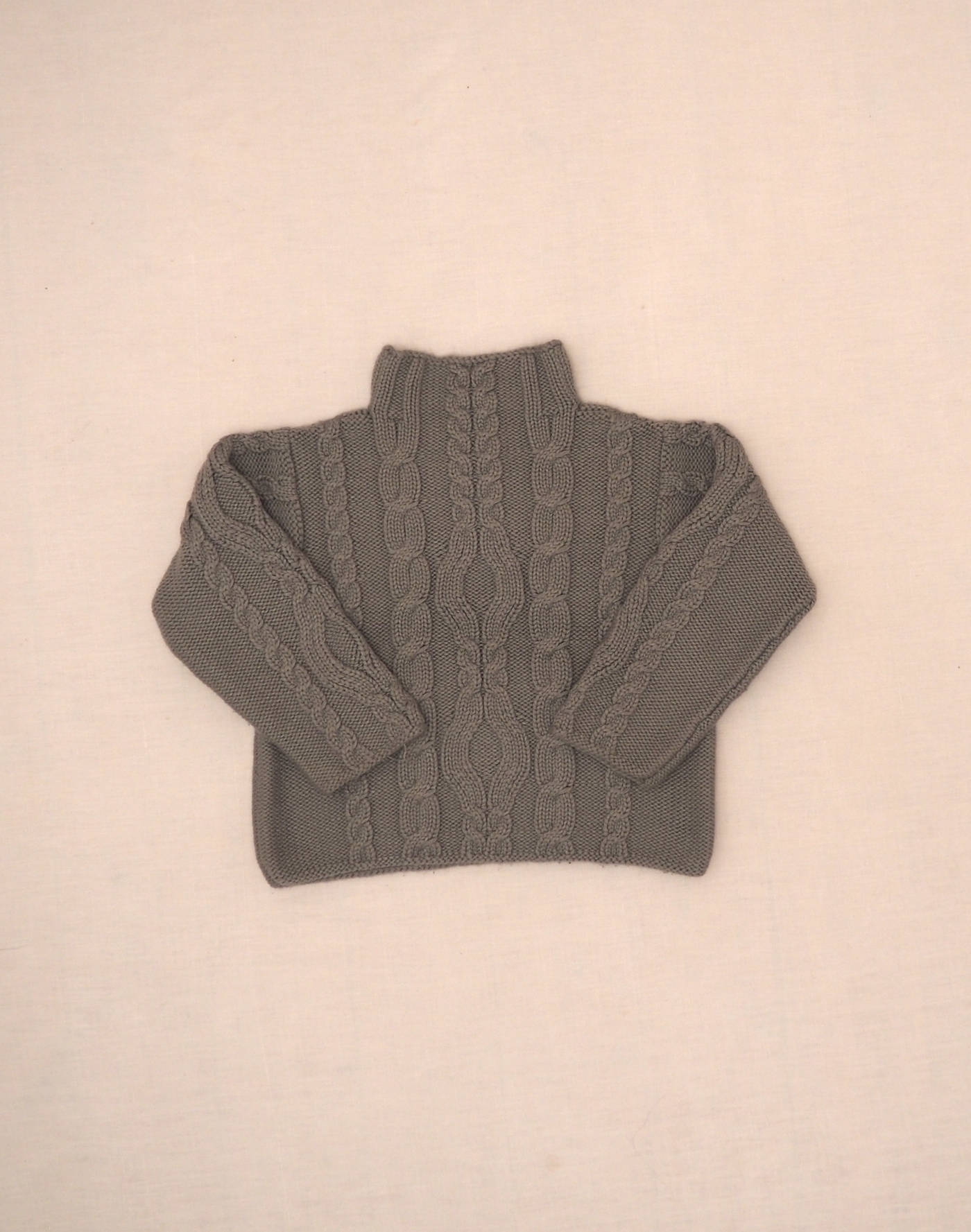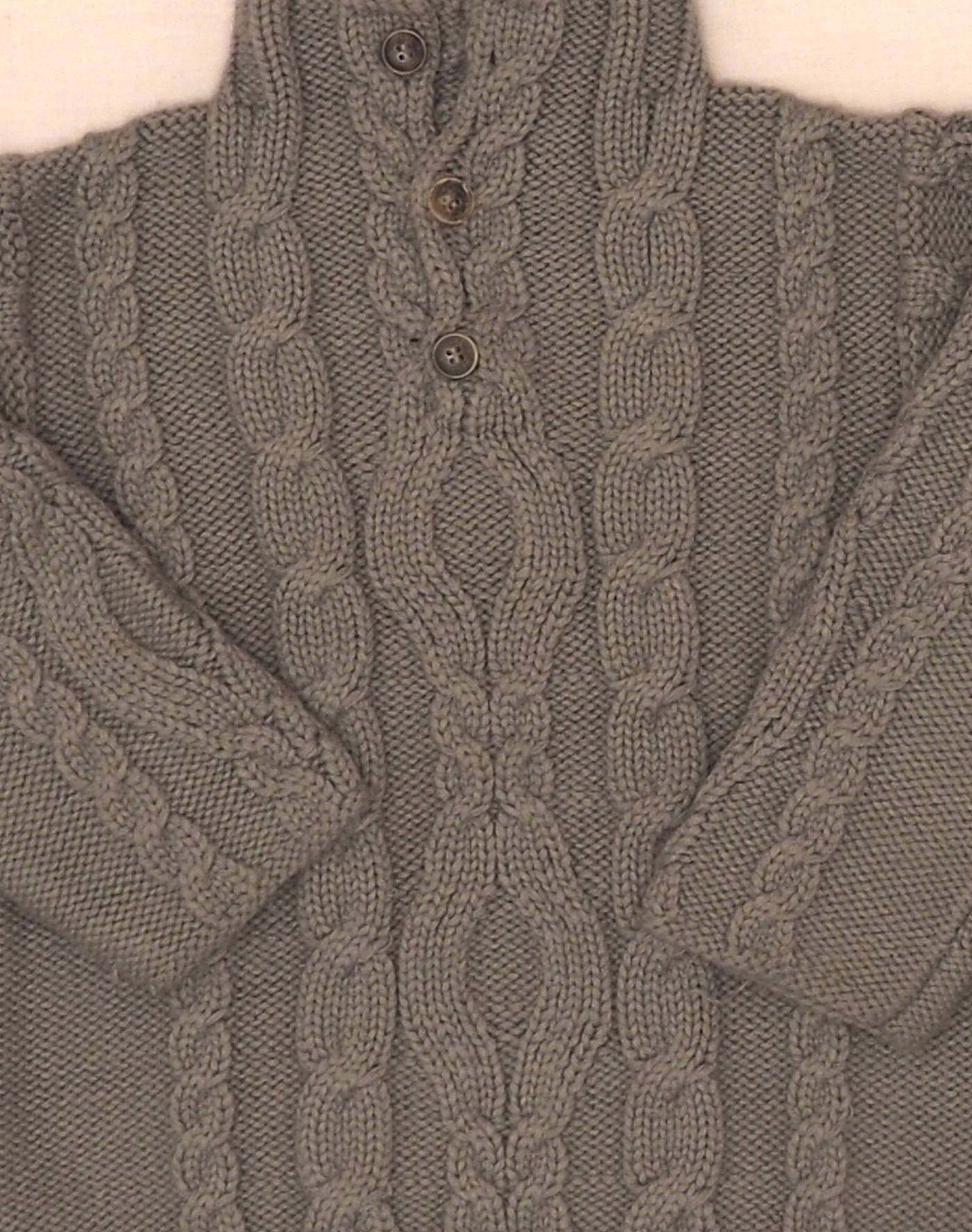 Beau pull à torsades, col légèrement montant fermé par trois boutons. Très bon état, pas d’étiquette de composition.