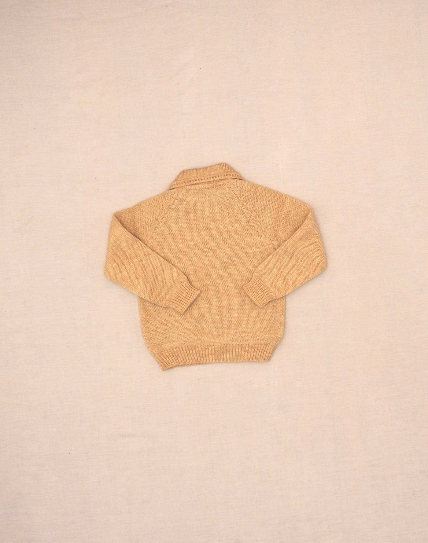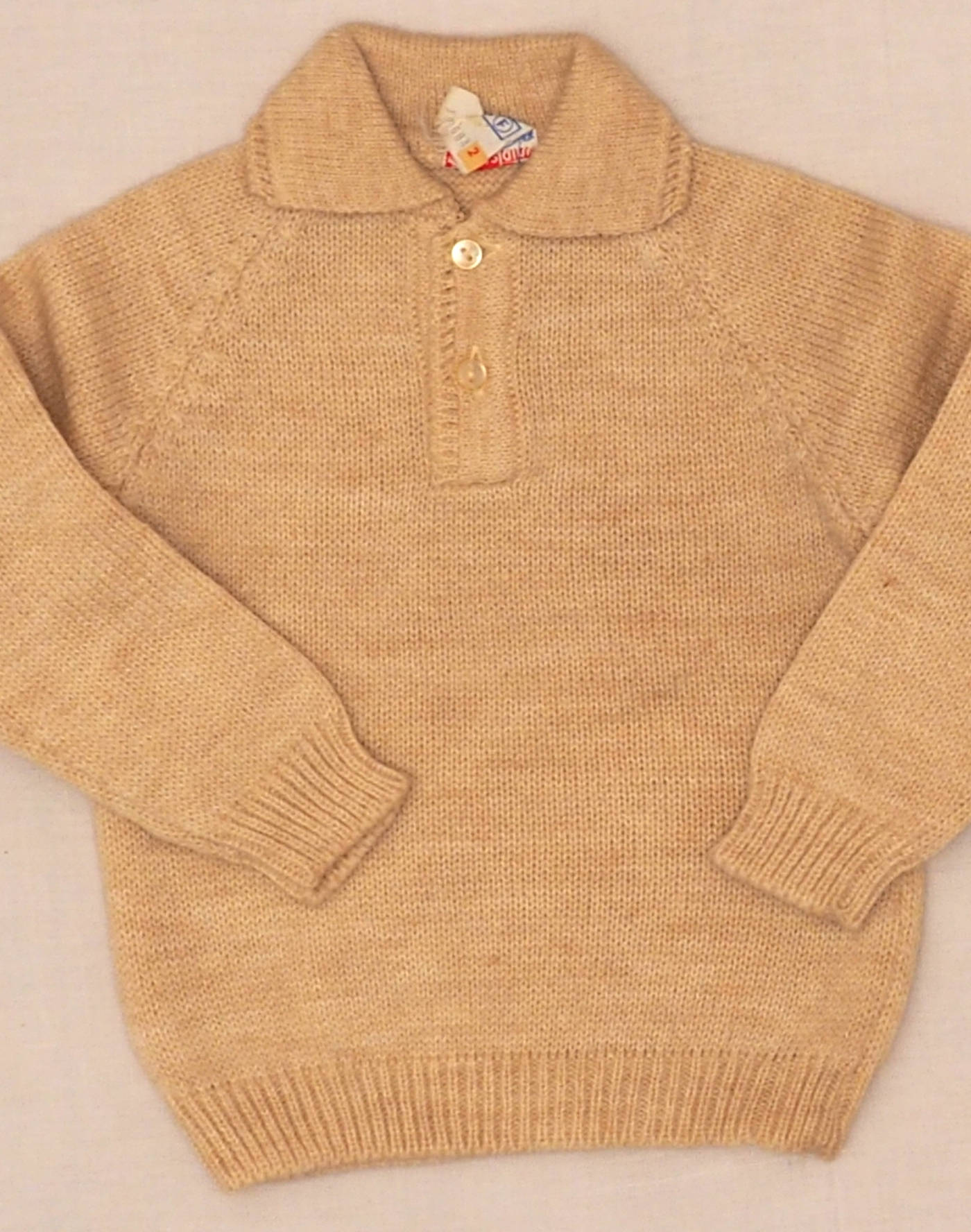 Années 1970. Beau pull chiné ton ivoire à manches longues raglan, petit col fermé par deux boutons. Fabriqué en France, très bon état, maille laine peignée & acrylique (proportions non précisées).