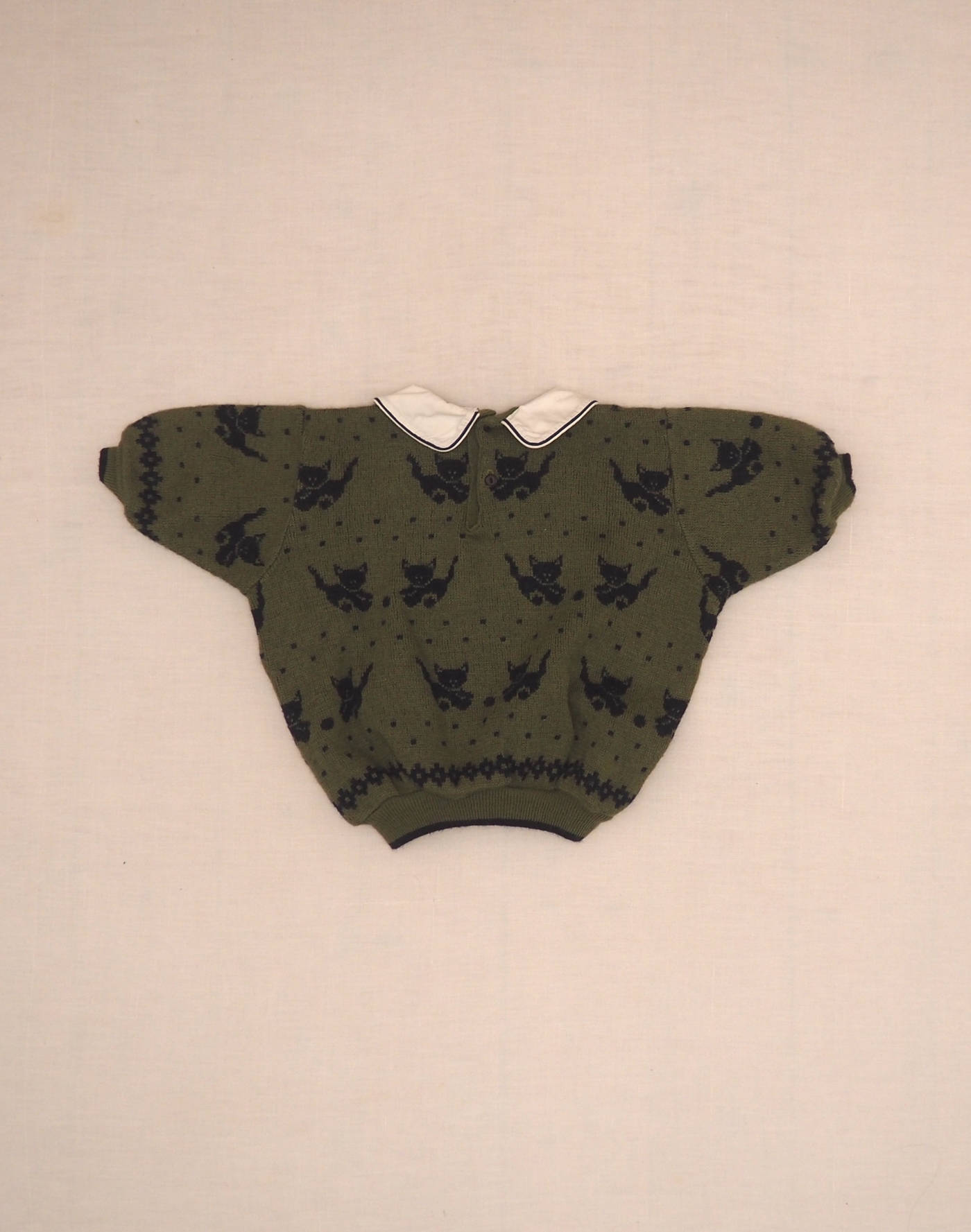 Très beau pull à la coupe 1980 très ample, en jacquard kaki à motif petits chats jouant avec une balle, col blanc en coton cousu bordé d’un passepoil bleu marine. Fermé dans le dos par deux boutons. Fabriqué en France, très bon état, maille 70% acrylique, 30% laine.