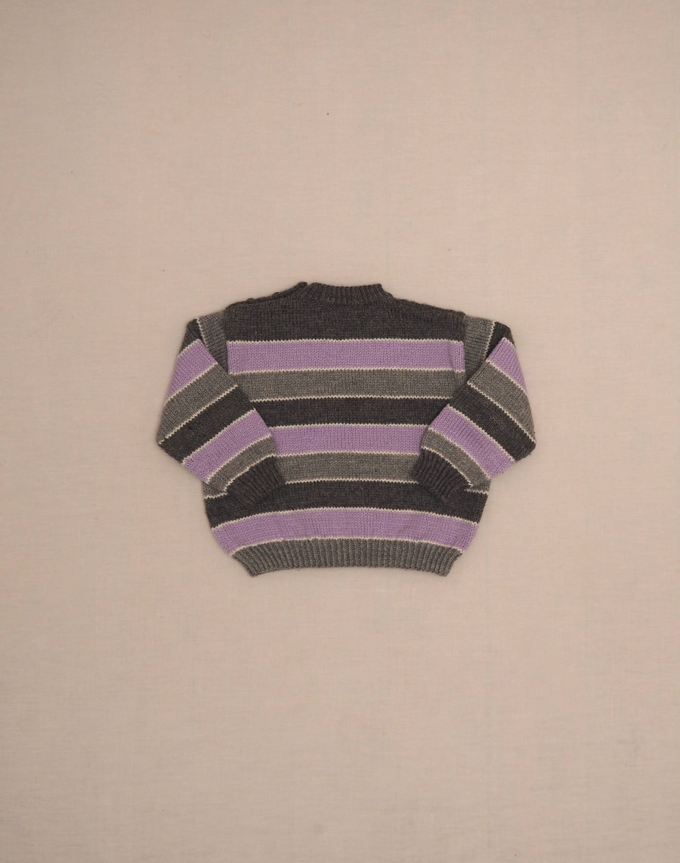 Pièce tricotée à la main. Charmant pull à rayures grises et mauves, fermé à l’épaule par trois boutons. Très bon état, toucher laine douce.