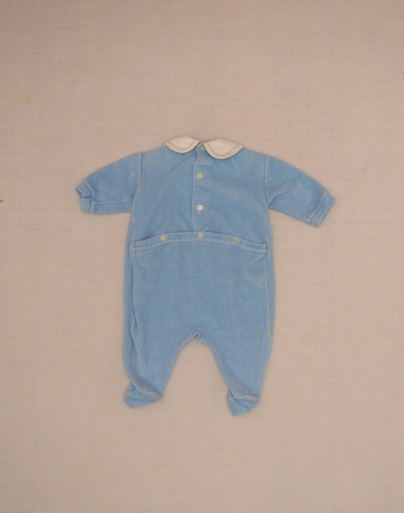 Jacadi vintage. Joli pyjama en jersey velours bleu clair avec buste en coon blanc smocké et petit col. Pieds intégrés, fermé dans le dos par trois boutons verticaux et trois boutons horizontaux. Très bon état, tissu 80% coton, 20% polyester.
