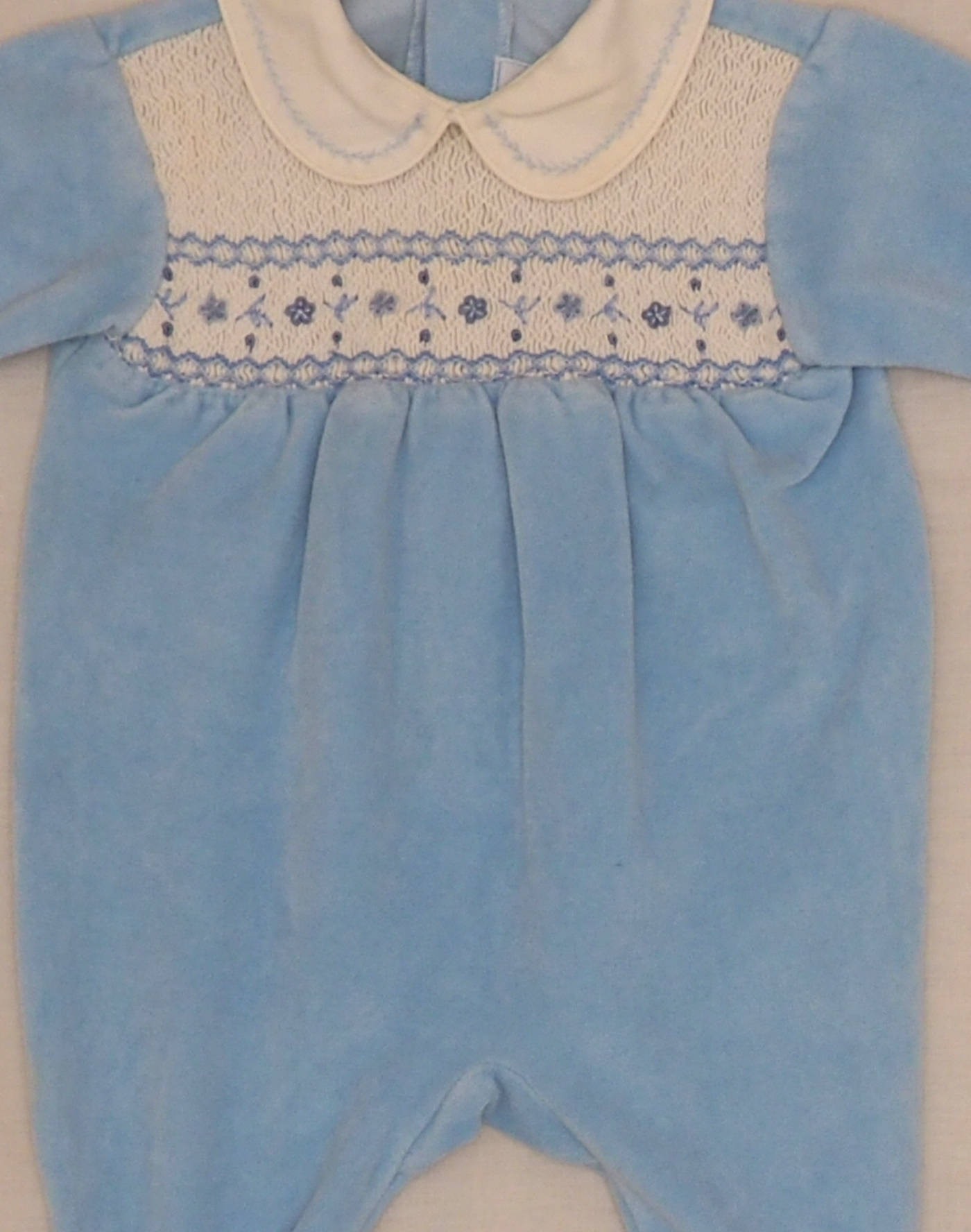 Jacadi vintage. Joli pyjama en jersey velours bleu clair avec buste en coon blanc smocké et petit col. Pieds intégrés, fermé dans le dos par trois boutons verticaux et trois boutons horizontaux. Très bon état, tissu 80% coton, 20% polyester.
