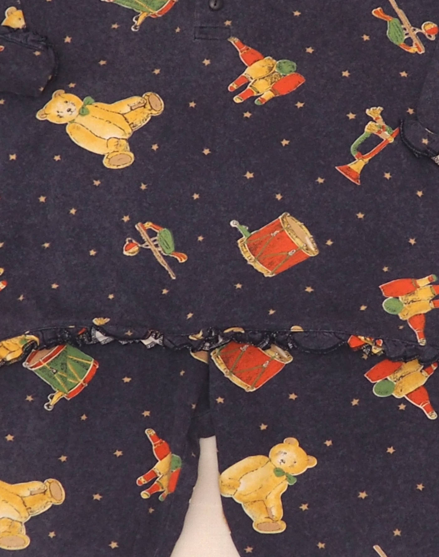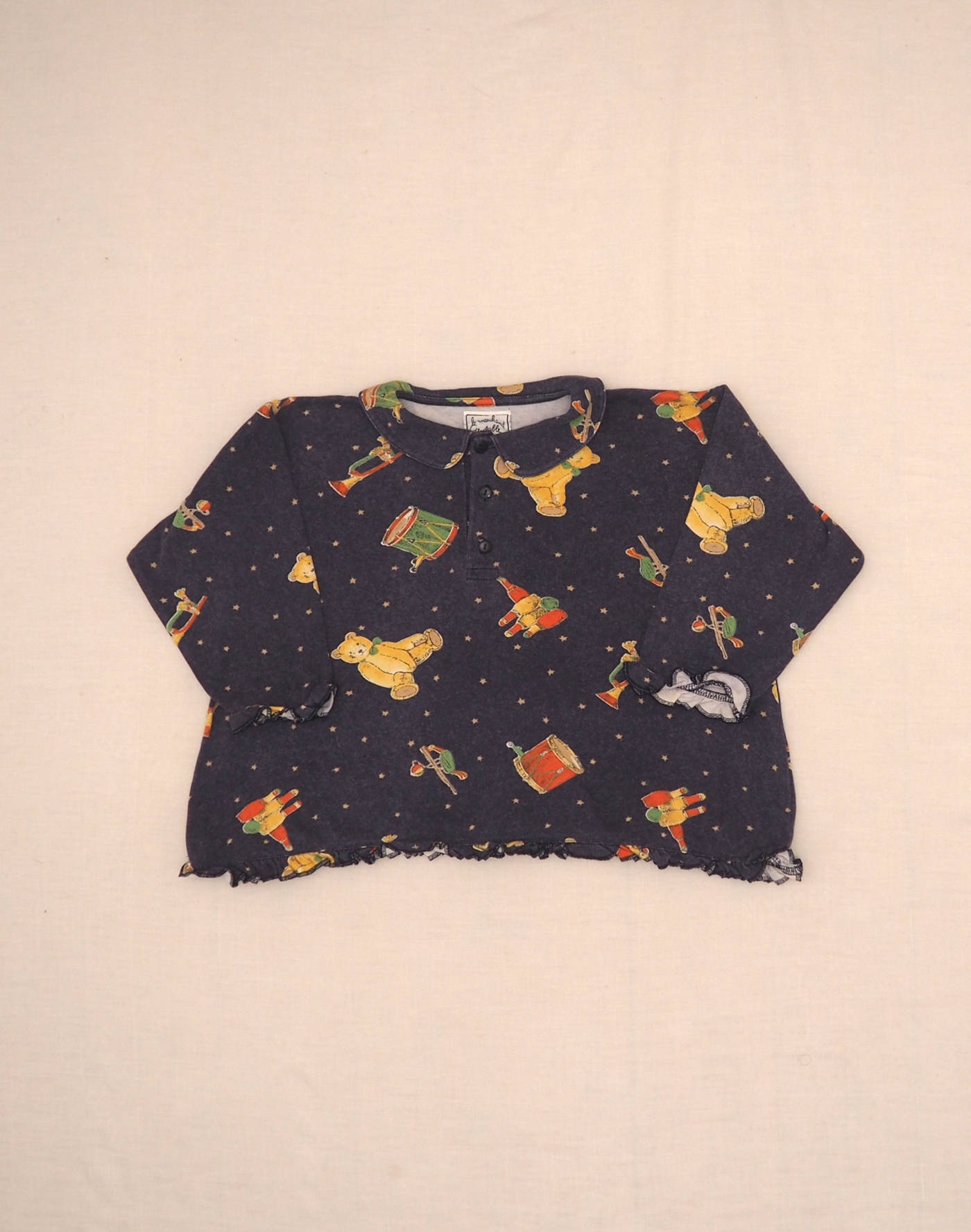 Taille 6 ans. Adorable pyjama deux pièces en jersey bleu marine chiné imprimé petites étoiles & jouets, composé d’un polo à bords froufrous, fermé par trois boutons, et d’un pantalon soorti taille élastique. Très bon état, 100% coton, fabriqué en Thaïlande.