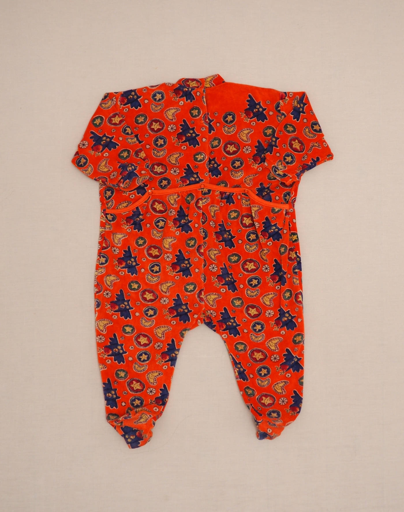 Très joli pyjama grenouillère en velours orange avec motif chouettes, lunes et étoiles, pieds intégrés, fermé dans le dos par cinq boutons pression verticaux, trois boutons pression horizontaux. Très bon état, velours 80% coton, 20% polyester.