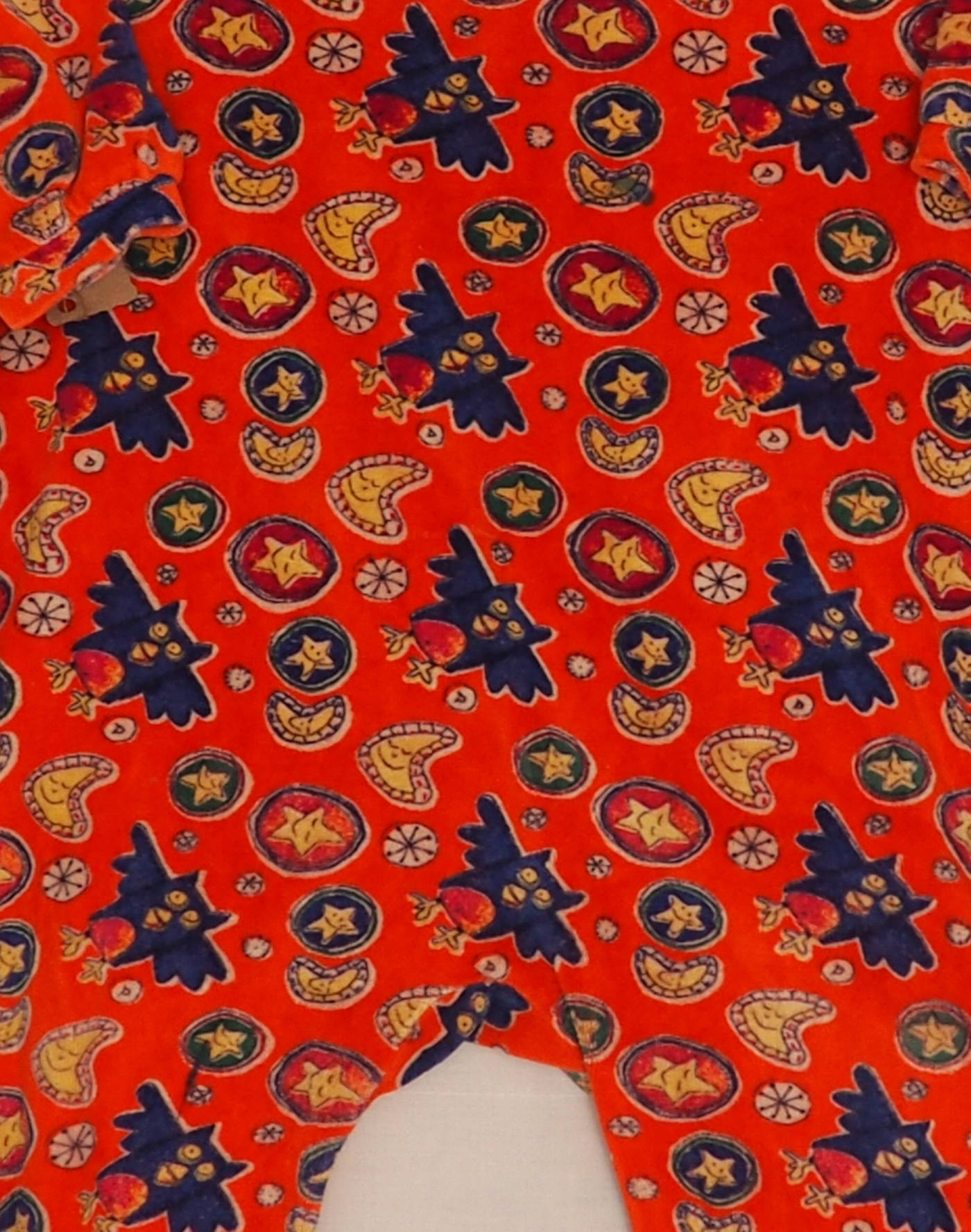 Très joli pyjama grenouillère en velours orange avec motif chouettes, lunes et étoiles, pieds intégrés, fermé dans le dos par cinq boutons pression verticaux, trois boutons pression horizontaux. Très bon état, velours 80% coton, 20% polyester.