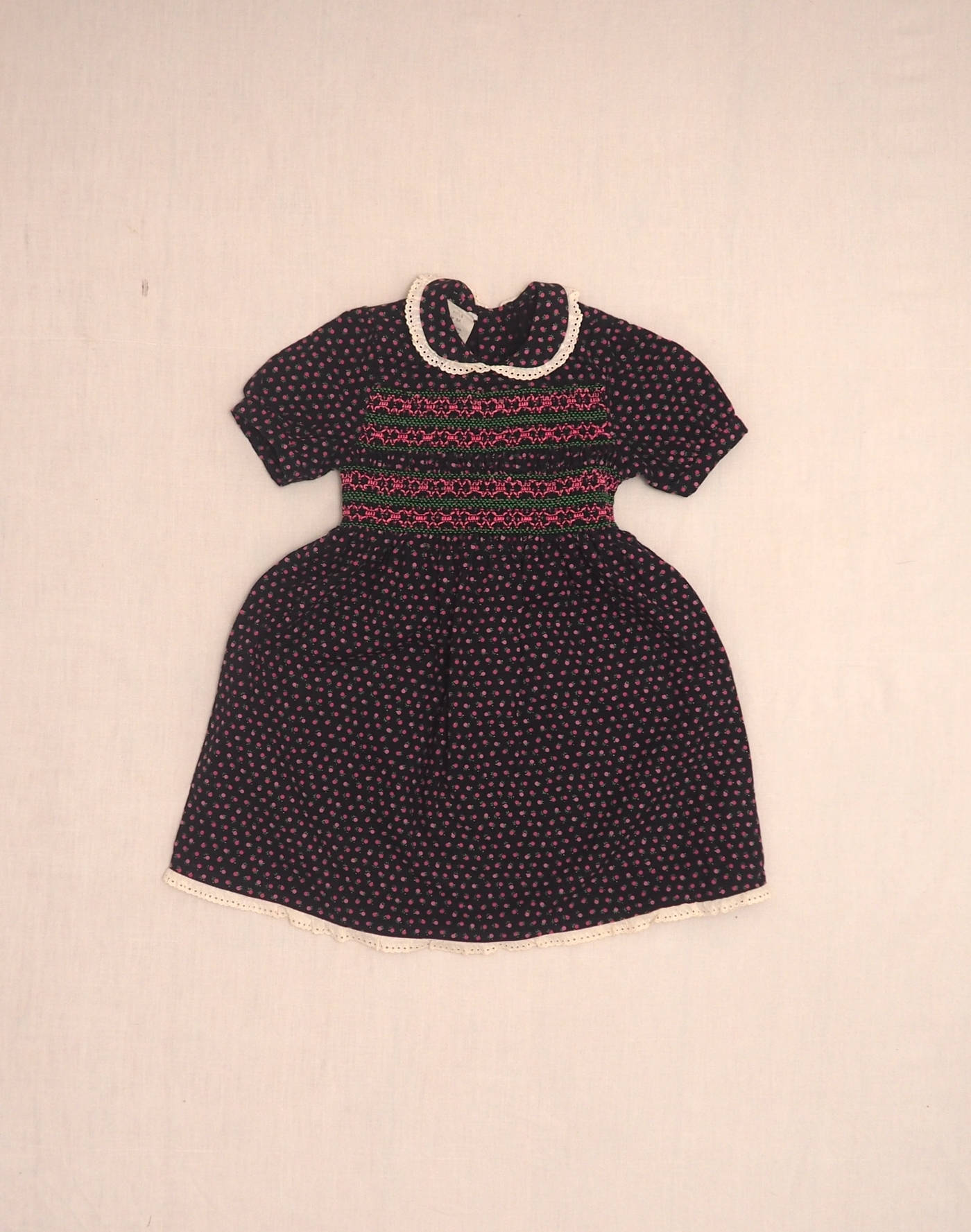 Mignonne robe légère en coton noir imprimé de petits fruits, smock sur le buste, col et jupon bordé de dentelle blanche, manches courtes ballon. Un lien à nouer à la taille. Fabriqué en France, très bon état, 100% coton.
