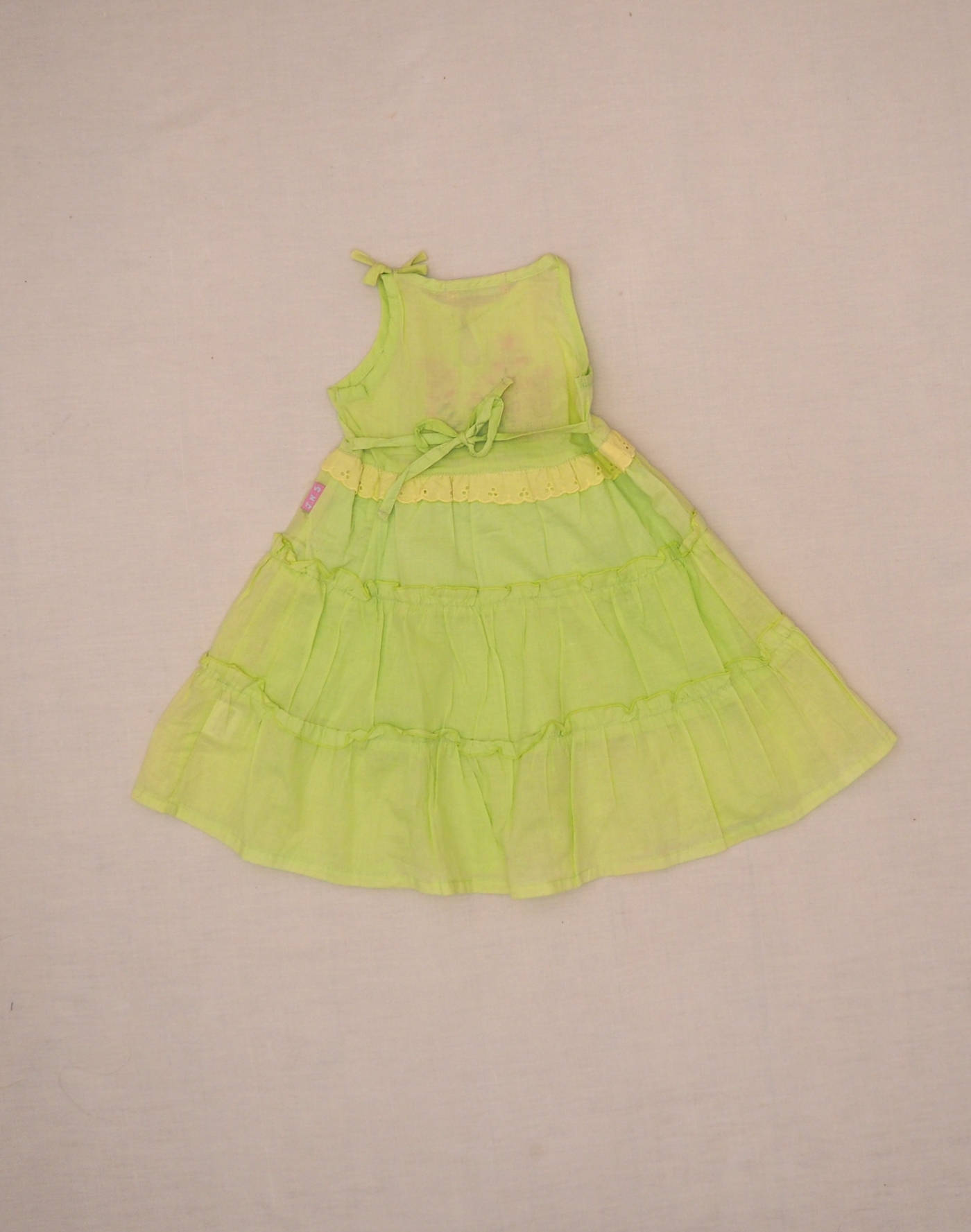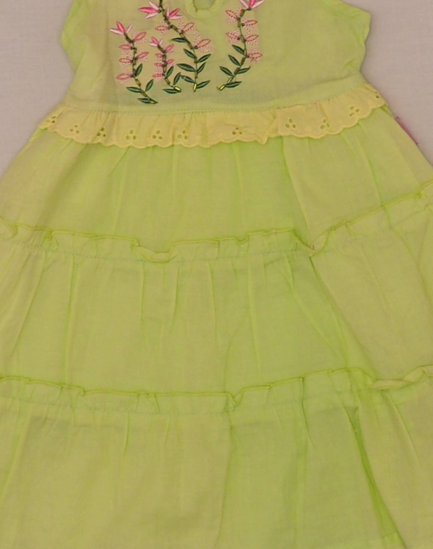 Belle robe d’été en coton vert pâle léger doublé, buste brodé de fleurs avec perles, trois niveaux de volants sur le jupon. Un petit bouton au col, noeud décoratif sur l’épaule. Très bon état, 100% coton.