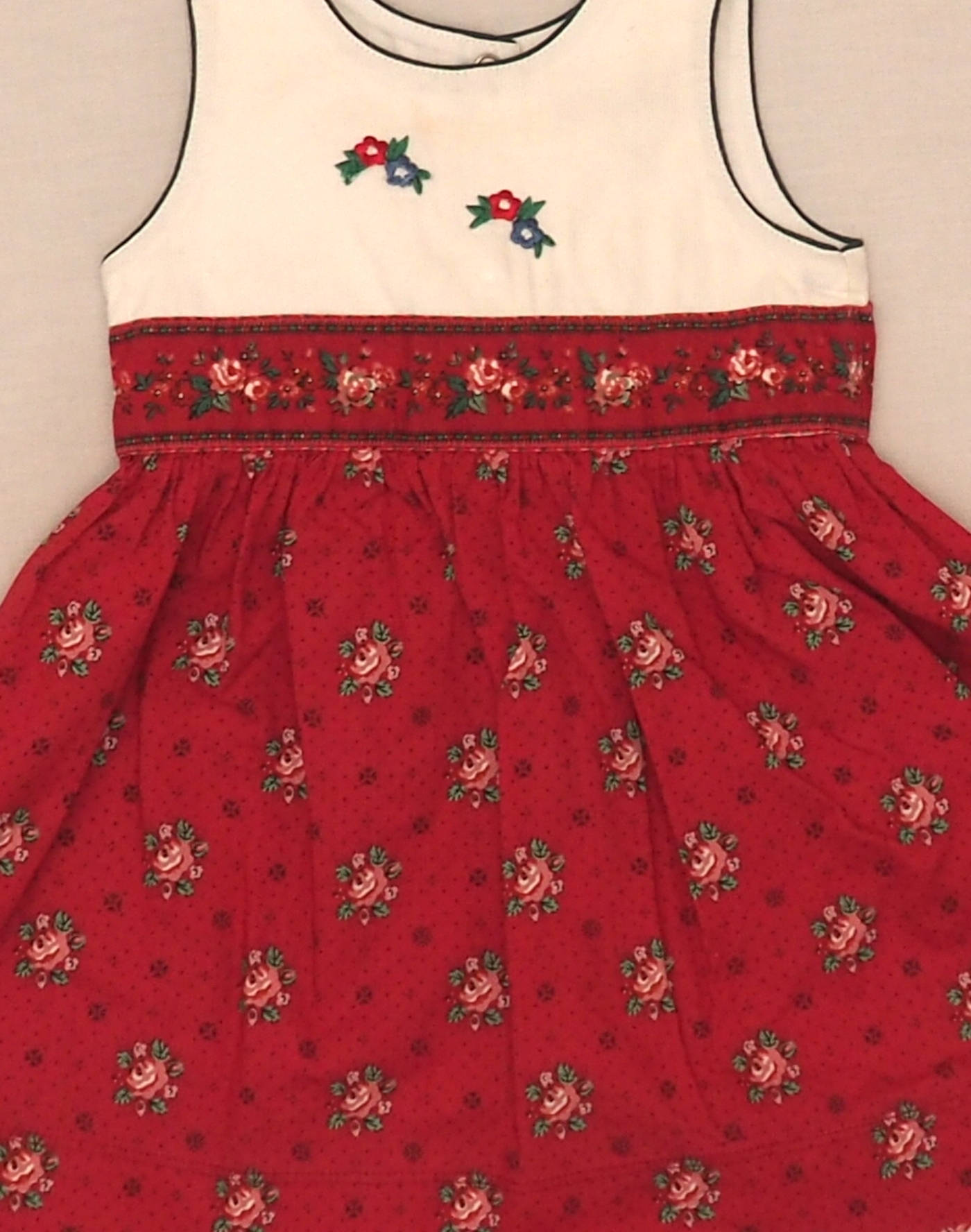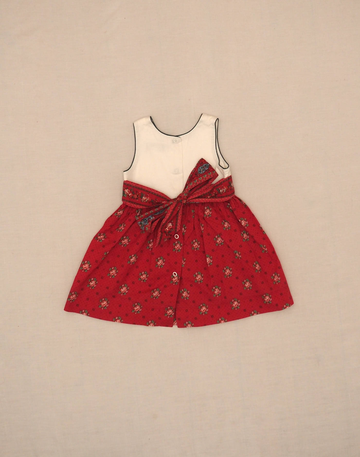 Elégante robe sans manches en coton blanc finement côtelé brodé de petites fleurs, doublé et bordé de passepoil vert sur le haut, jupon rouge à motif fleuri avec ceinture intégrée à nouer dans le dos. Fermée dans le dos par cinq boutons pression. Fabriquée en France, 100% coton.