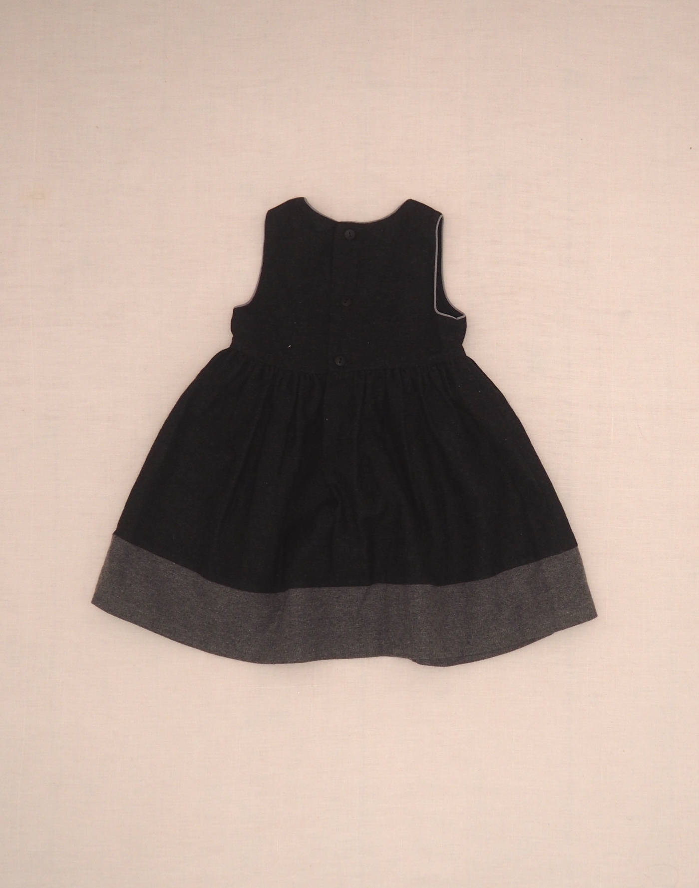 Elégante robe chasuble grise doublée sur le buste, frise contrastante sur le bas de robe et passepoil gris clair sur les épaules et le col, trois pinces sur le buste brodées de petits coeurs. Fermée dans le dos par trois boutons. Très bon état, tissu 35% laine, 35% acrylique et 30% polyester.