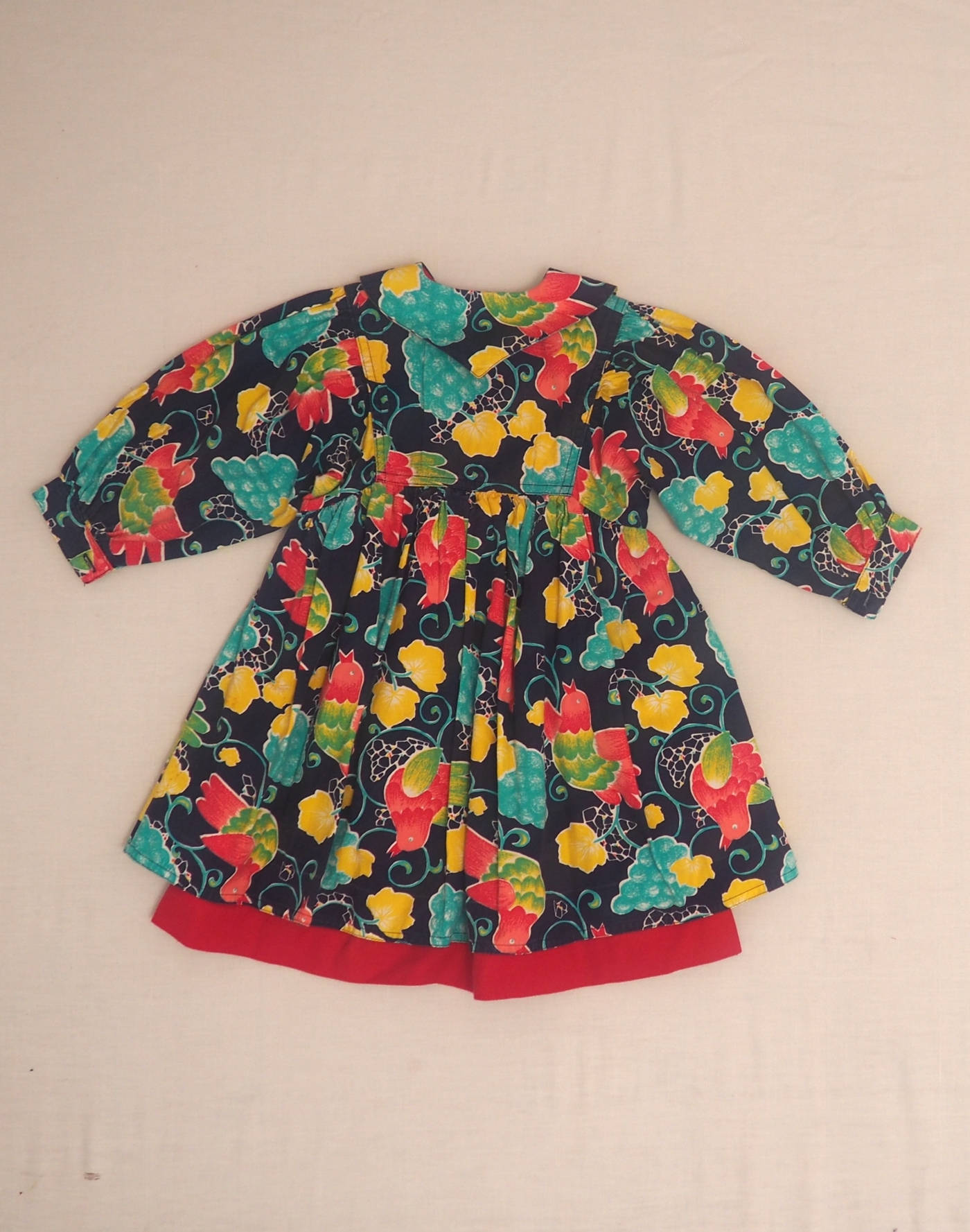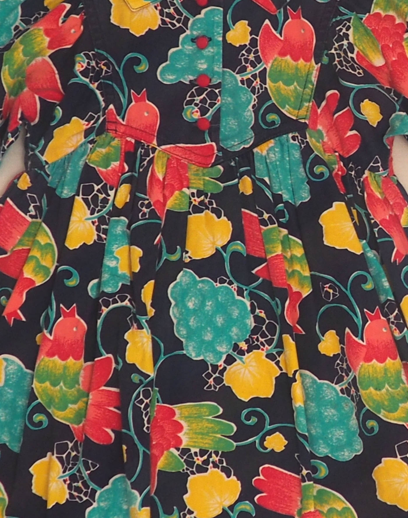Charmante robe d’hiver entièrement doublée, à motif fleurs & oiseaux, manches longues boutonnées, col effet foulard, double jupon fuschia, fermée devant par cinq boutons recouverts de tissu. Fabriqué en France, très bon état, 100% coton.